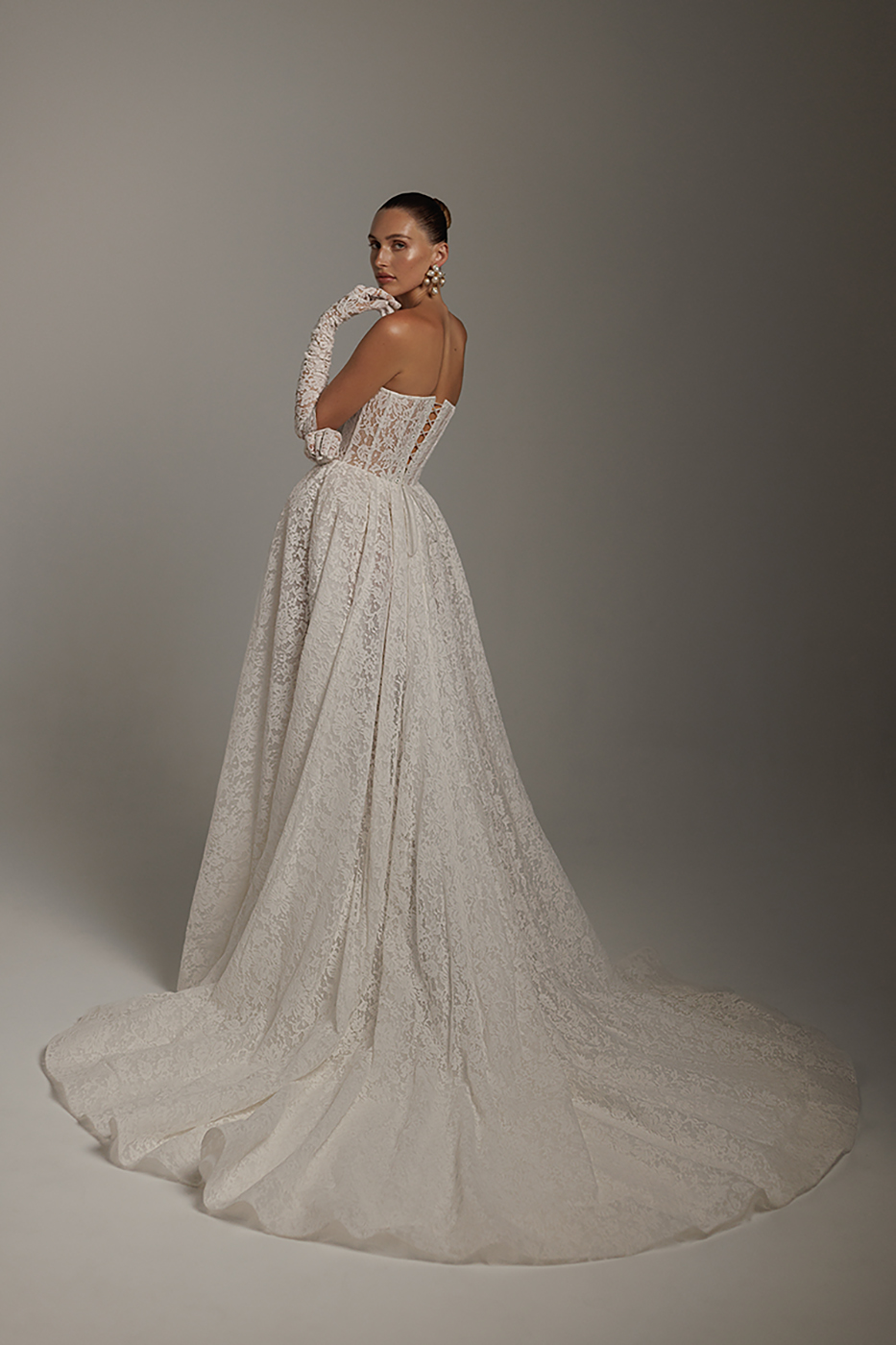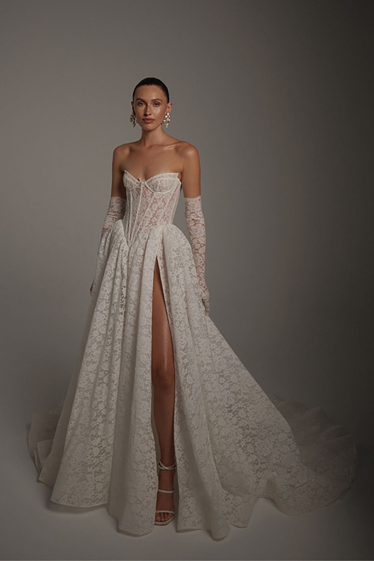 Das Brautkleid Amara 26-101 vereint eine elegante Spitzen Corsage mit dramatischem Beinschlitz für einen modernen, verführerischen Look. Diese trägerlose Robe aus floraler Spitze ist das perfekte Highlight für Bräute, die zeitlose Romantik neu interpretieren möchten.