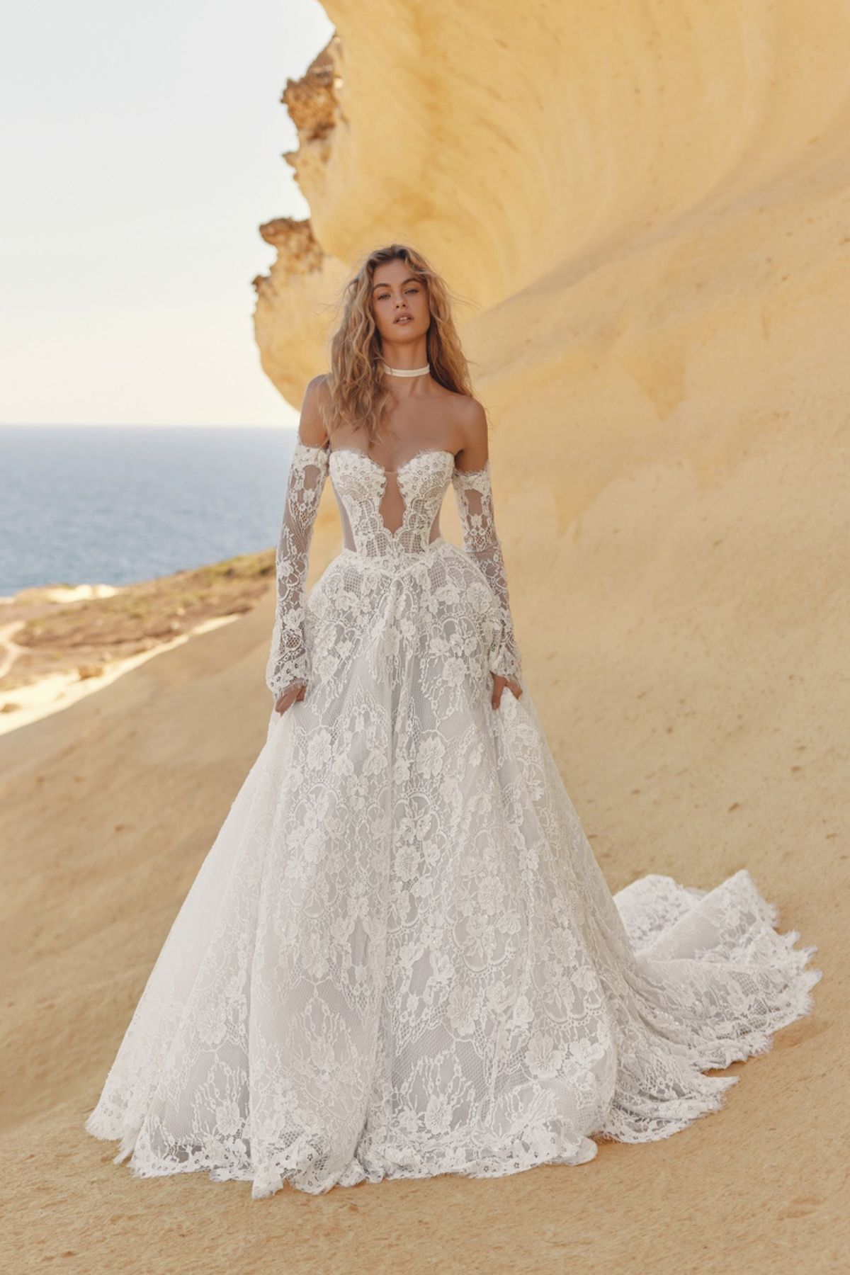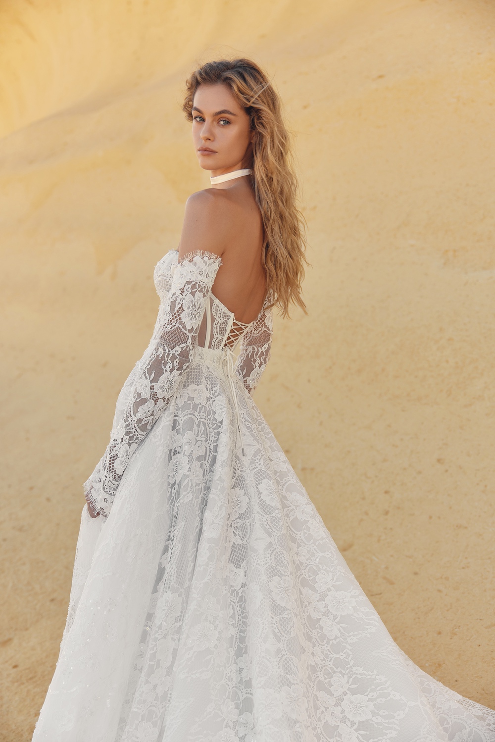 Das Argo Brautkleid vereint luxuriöse Spitze mit moderner Romantik in einer voluminösen A-Linie, abnehmbaren langen Ärmeln und figurbetontem Korsagenoberteil für eine elegante, sinnliche Silhouette. Mit Schnürung am Rücken, fließender Schleppe in Kapellenlänge und wandelbarem Look ist dieses Brautkleid ideal für Bräute, die ein königliches und zugleich vielseitiges Hochzeitskleid suchen.