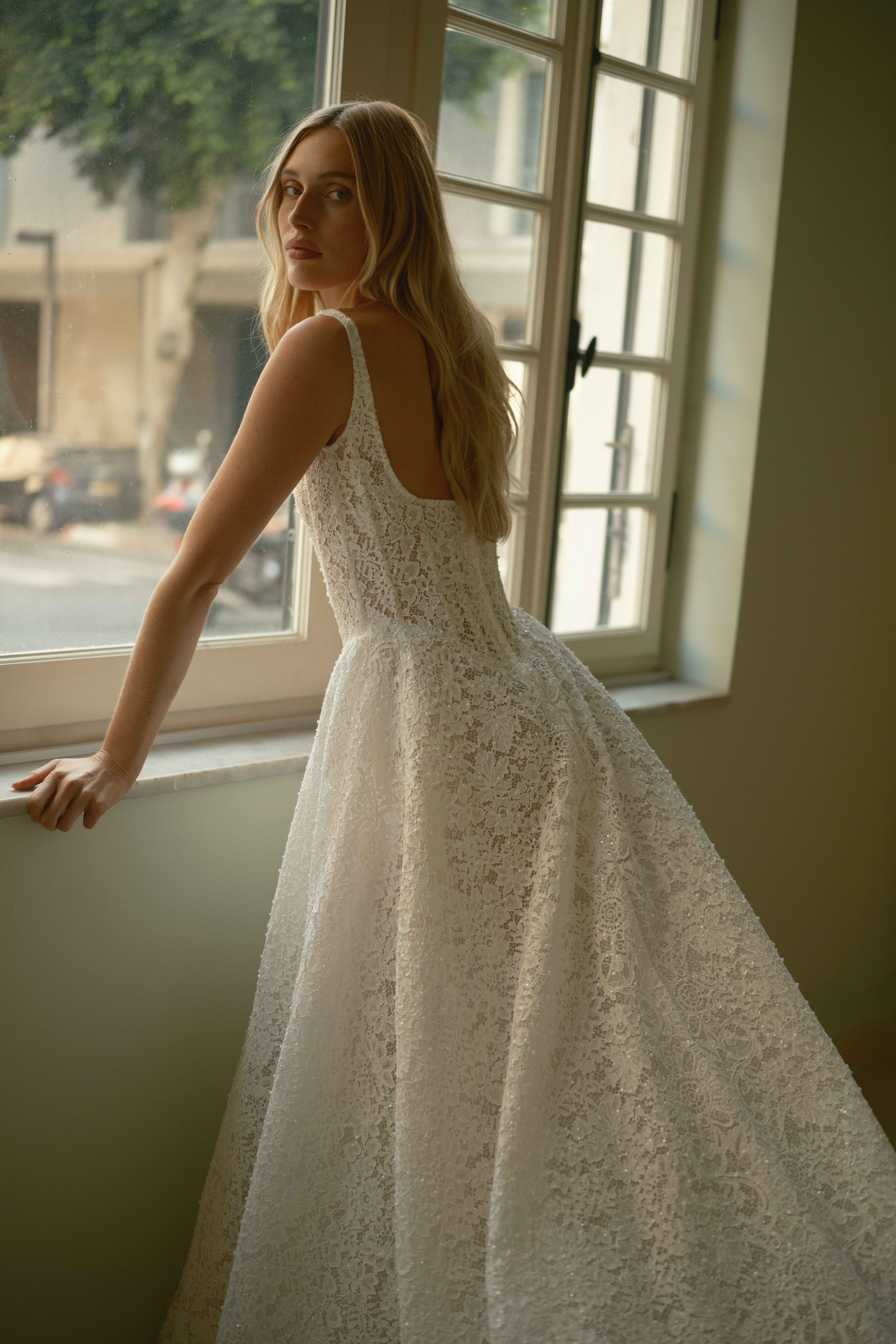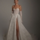 Dieses romantische A-Linien-Brautkleid aus edler, perlenbestickter Spitze mit schmalen Trägern und gerader Corsage betont durch die Basque-Taille die feminine Silhouette, während der Rock mit Schleppe für einen eleganten, zeitlosen Look sorgt