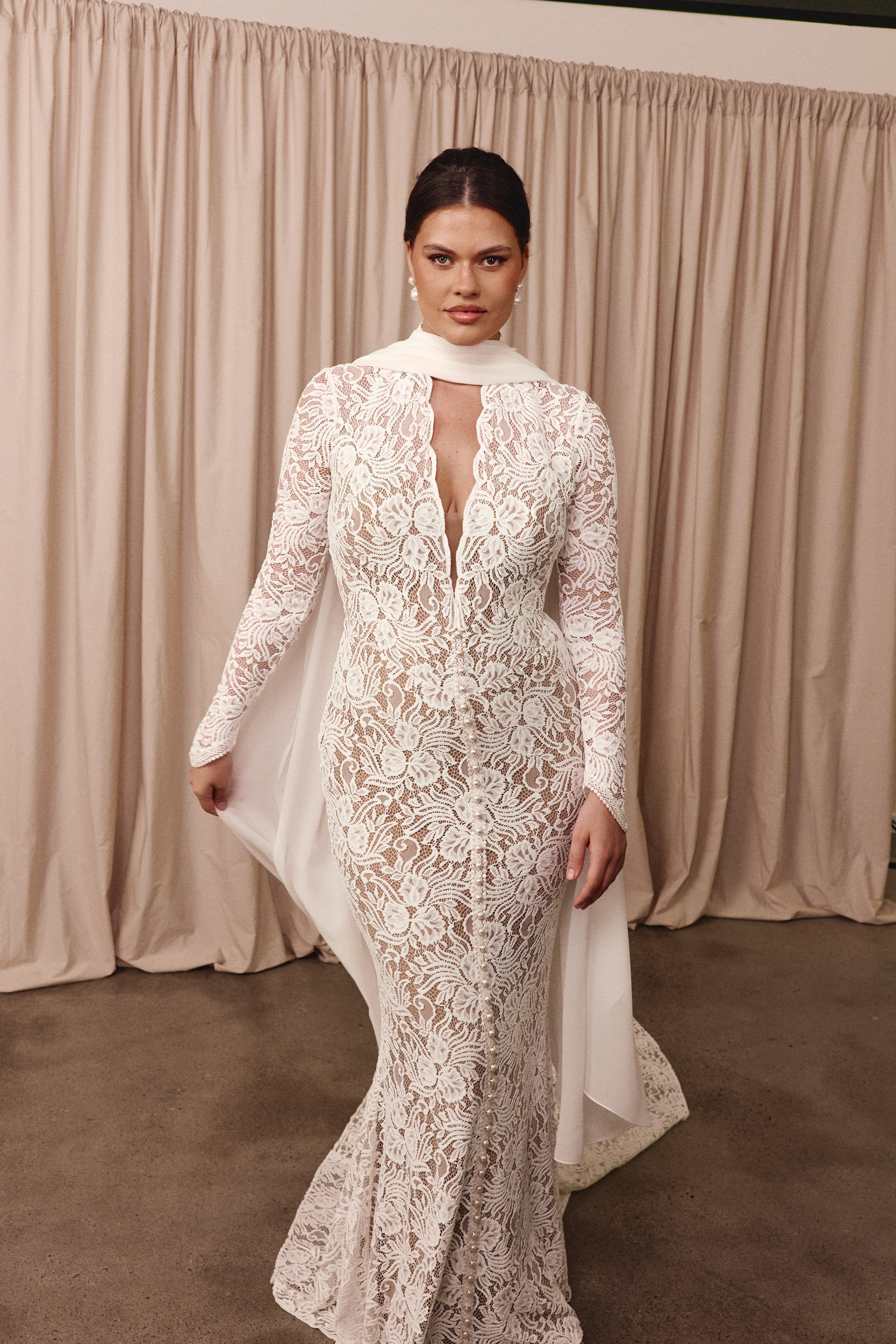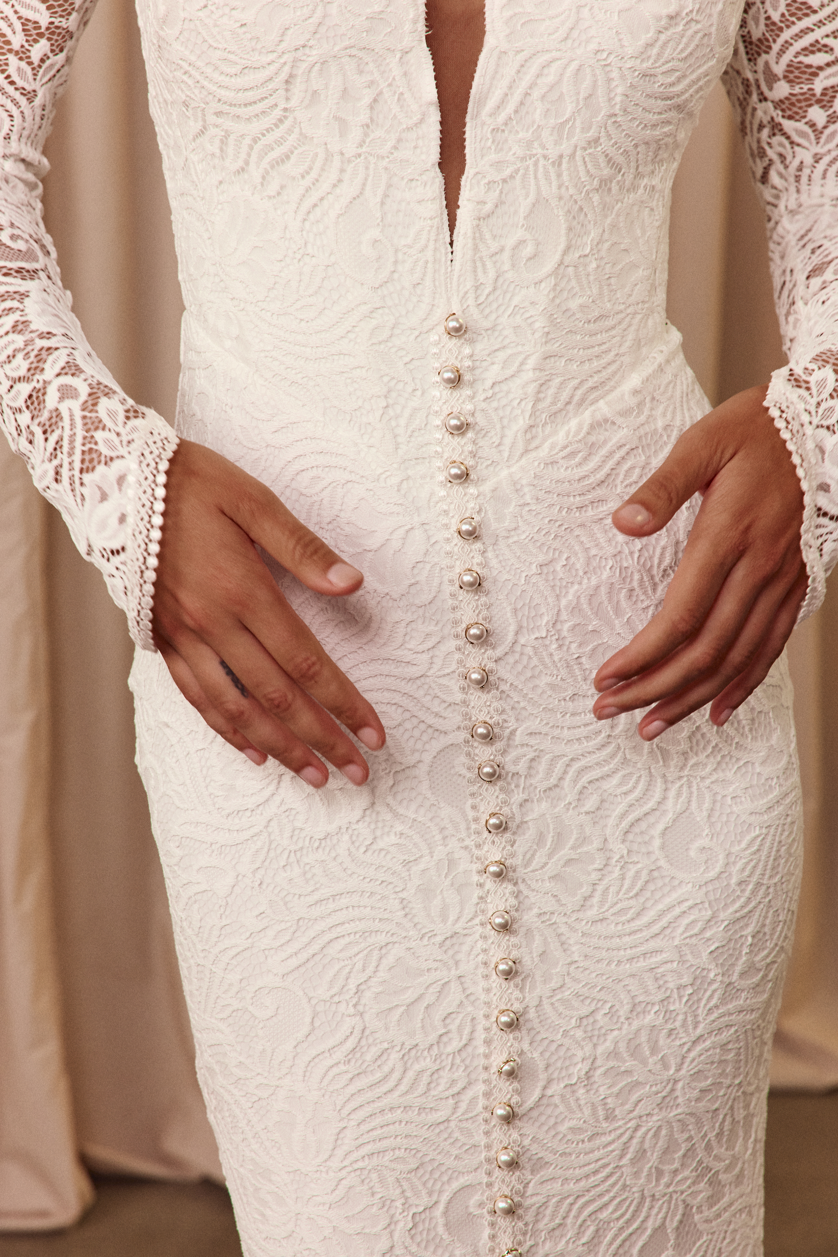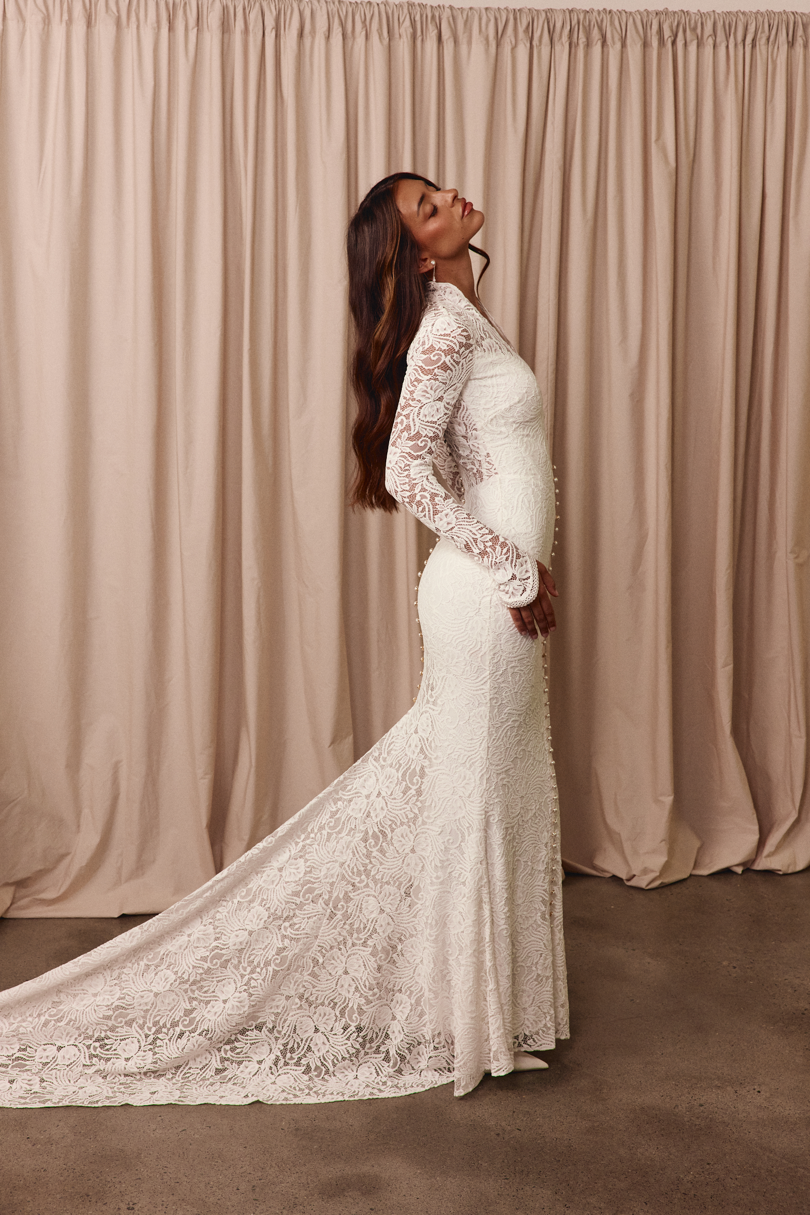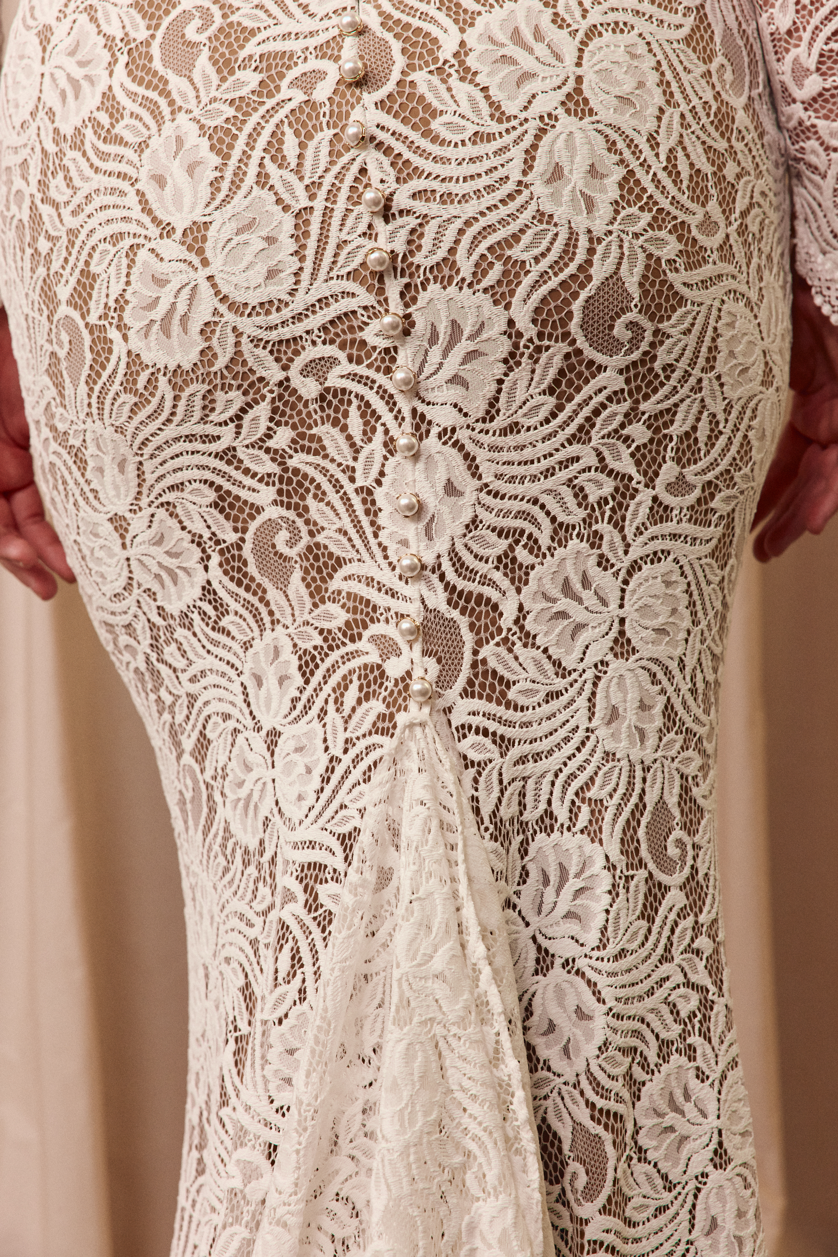 Das Baya Brautkleid begeistert mit einer modernen Fit-and-Flare-Silhouette aus edler Stretchspitze, die die Figur betont und durch eingearbeitete Corsagenstruktur optimalen Halt bietet. Ein tiefer V-Ausschnitt, lange Spitzenärmel und eine elegante Knopfleiste mit Perleneffekt vorne und hinten verleihen diesem Spitzenbrautkleid einen romantischen, zugleich modernen Charakter – perfekt für die selbstbewusste, stilbewusste Braut