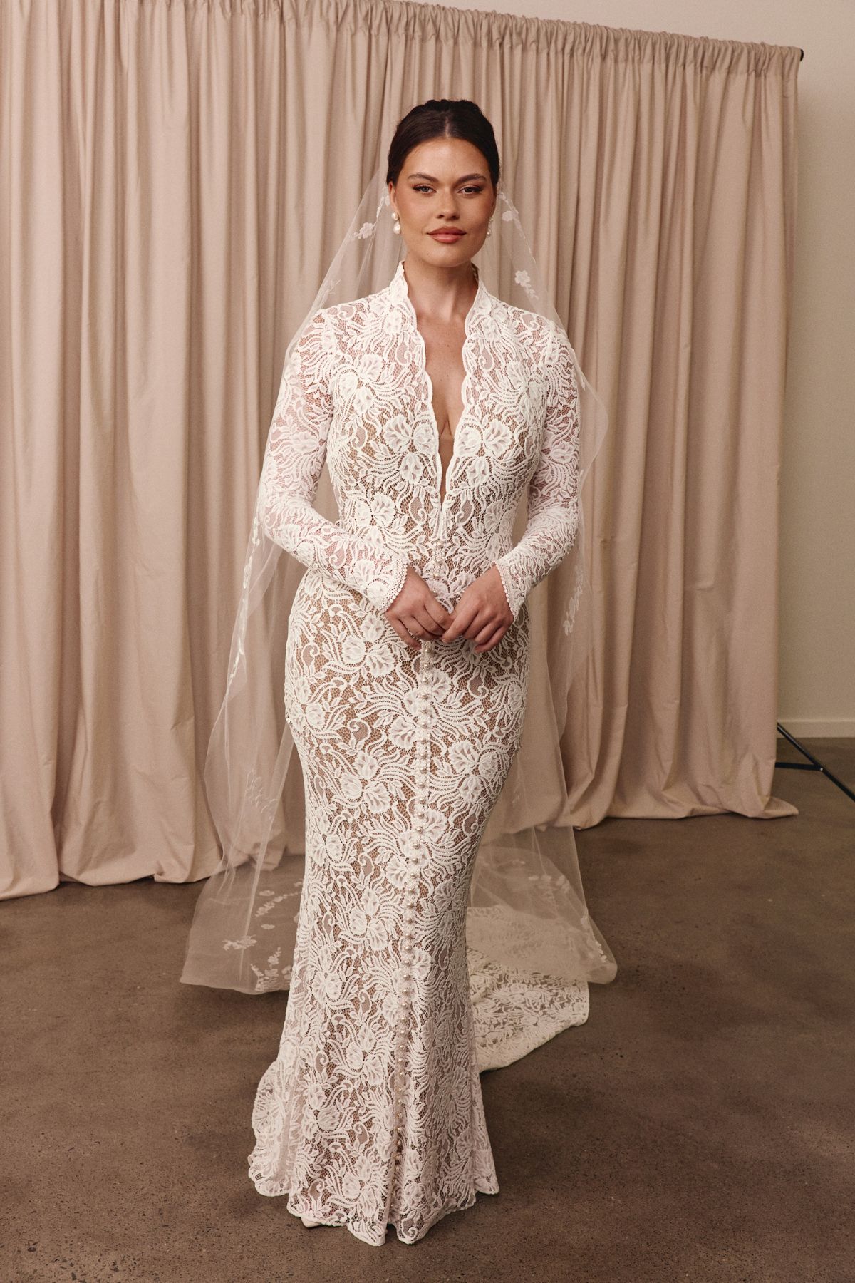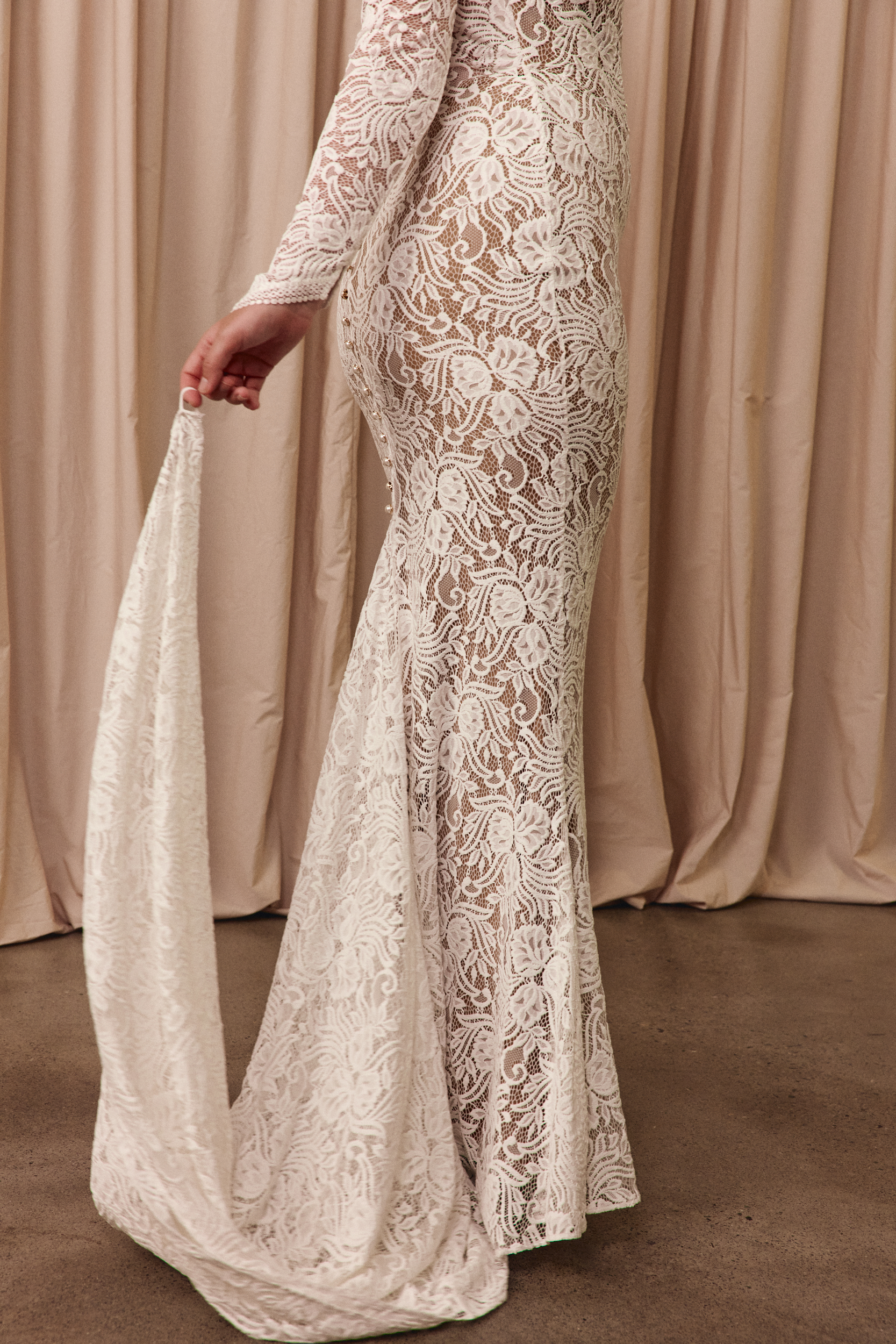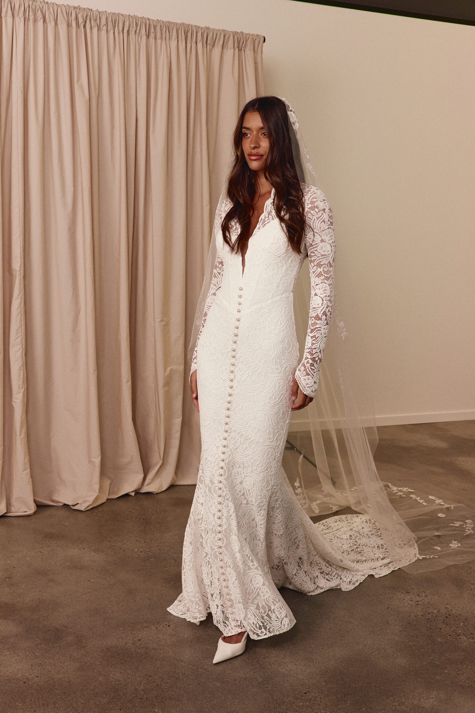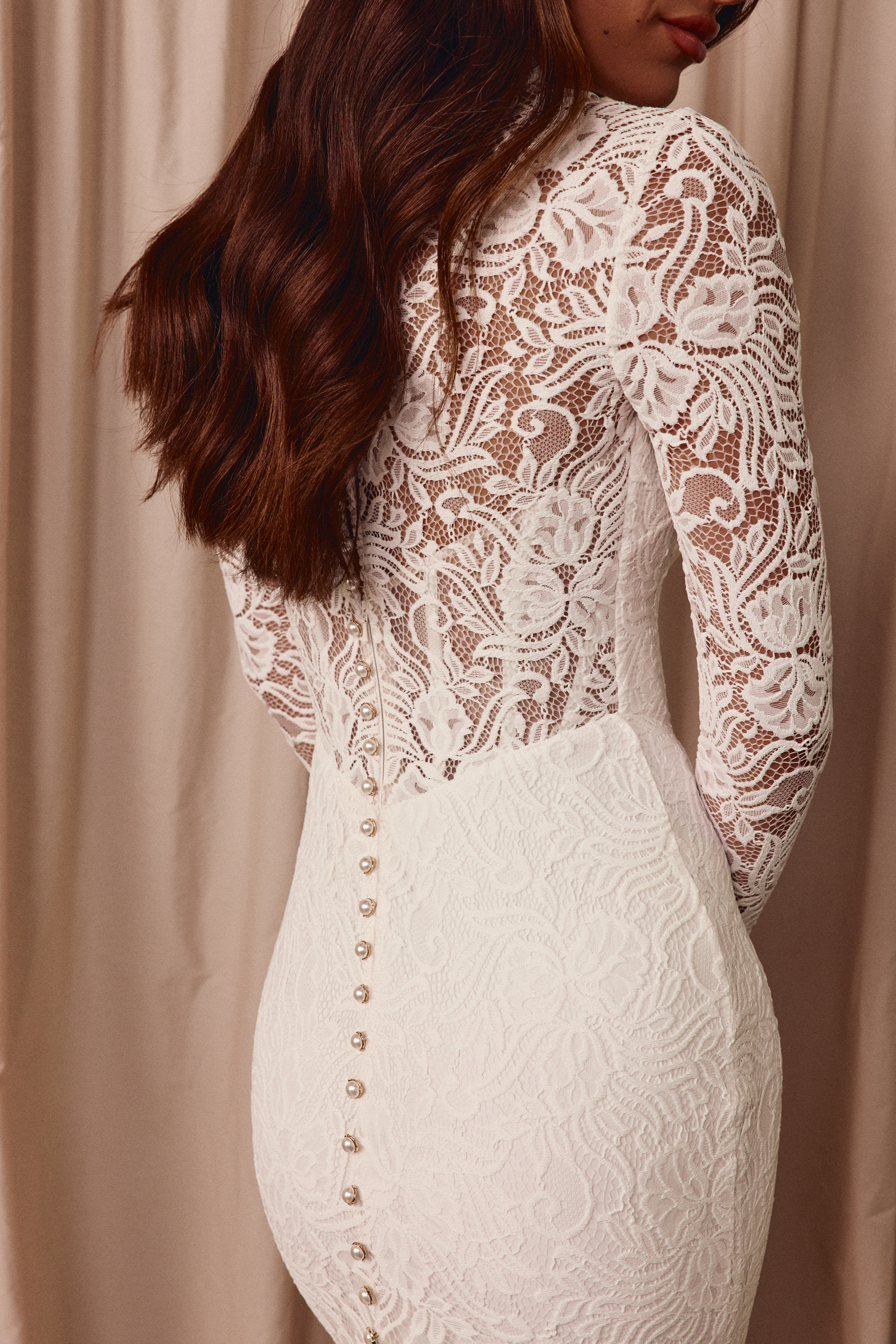 Das Baya Brautkleid begeistert mit einer modernen Fit-and-Flare-Silhouette aus edler Stretchspitze, die die Figur betont und durch eingearbeitete Corsagenstruktur optimalen Halt bietet. Ein tiefer V-Ausschnitt, lange Spitzenärmel und eine elegante Knopfleiste mit Perleneffekt vorne und hinten verleihen diesem Spitzenbrautkleid einen romantischen, zugleich modernen Charakter – perfekt für die selbstbewusste, stilbewusste Braut