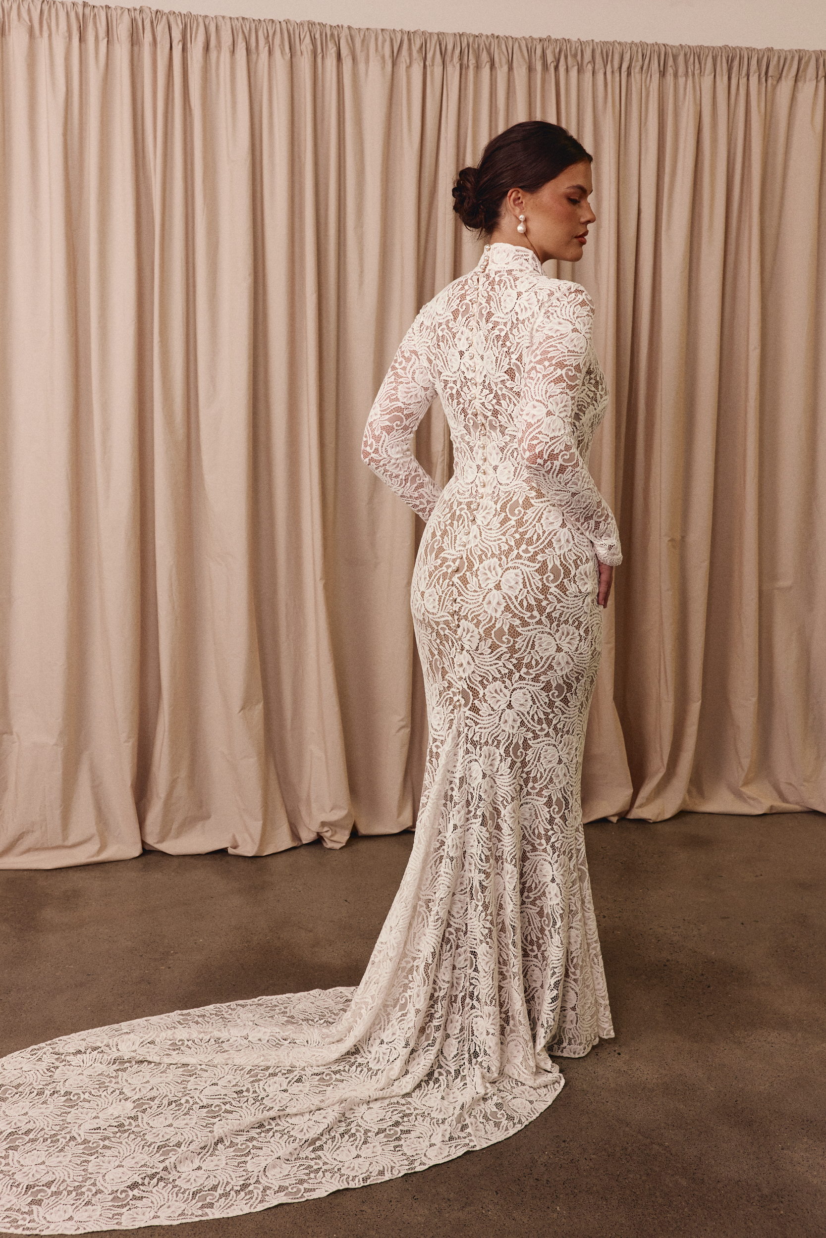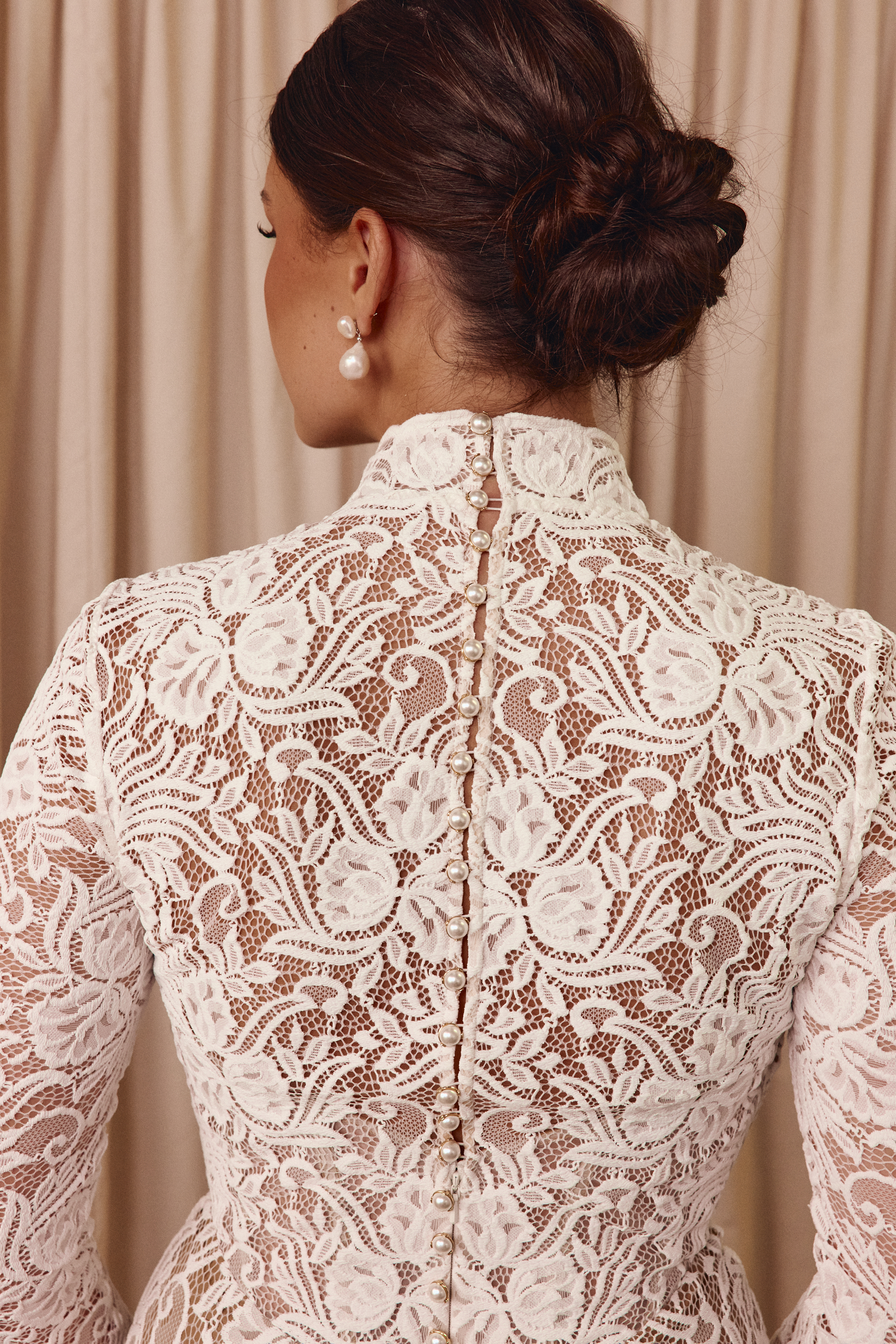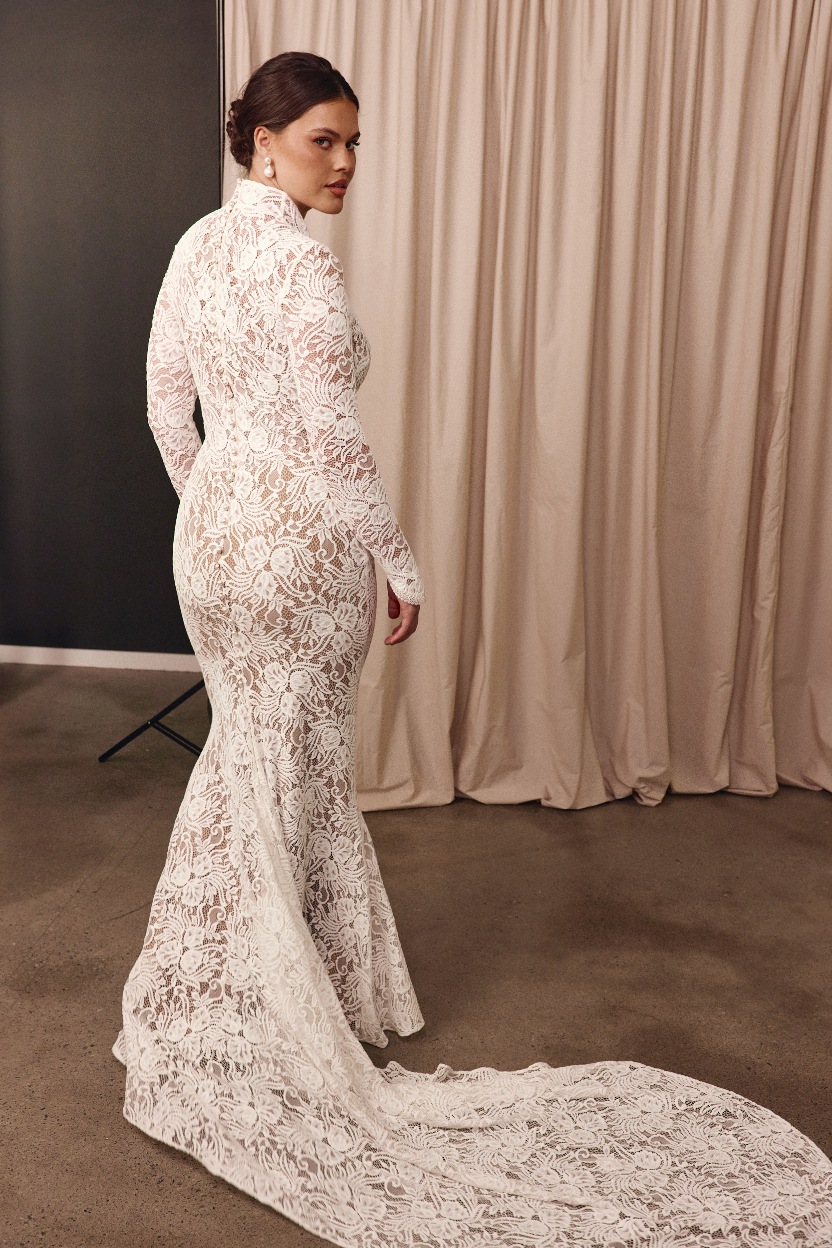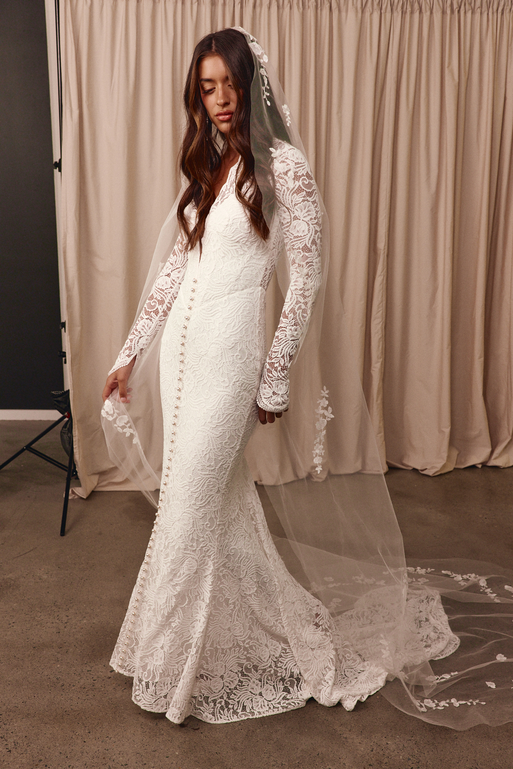 Das Baya Brautkleid begeistert mit einer modernen Fit-and-Flare-Silhouette aus edler Stretchspitze, die die Figur betont und durch eingearbeitete Corsagenstruktur optimalen Halt bietet. Ein tiefer V-Ausschnitt, lange Spitzenärmel und eine elegante Knopfleiste mit Perleneffekt vorne und hinten verleihen diesem Spitzenbrautkleid einen romantischen, zugleich modernen Charakter – perfekt für die selbstbewusste, stilbewusste Braut