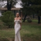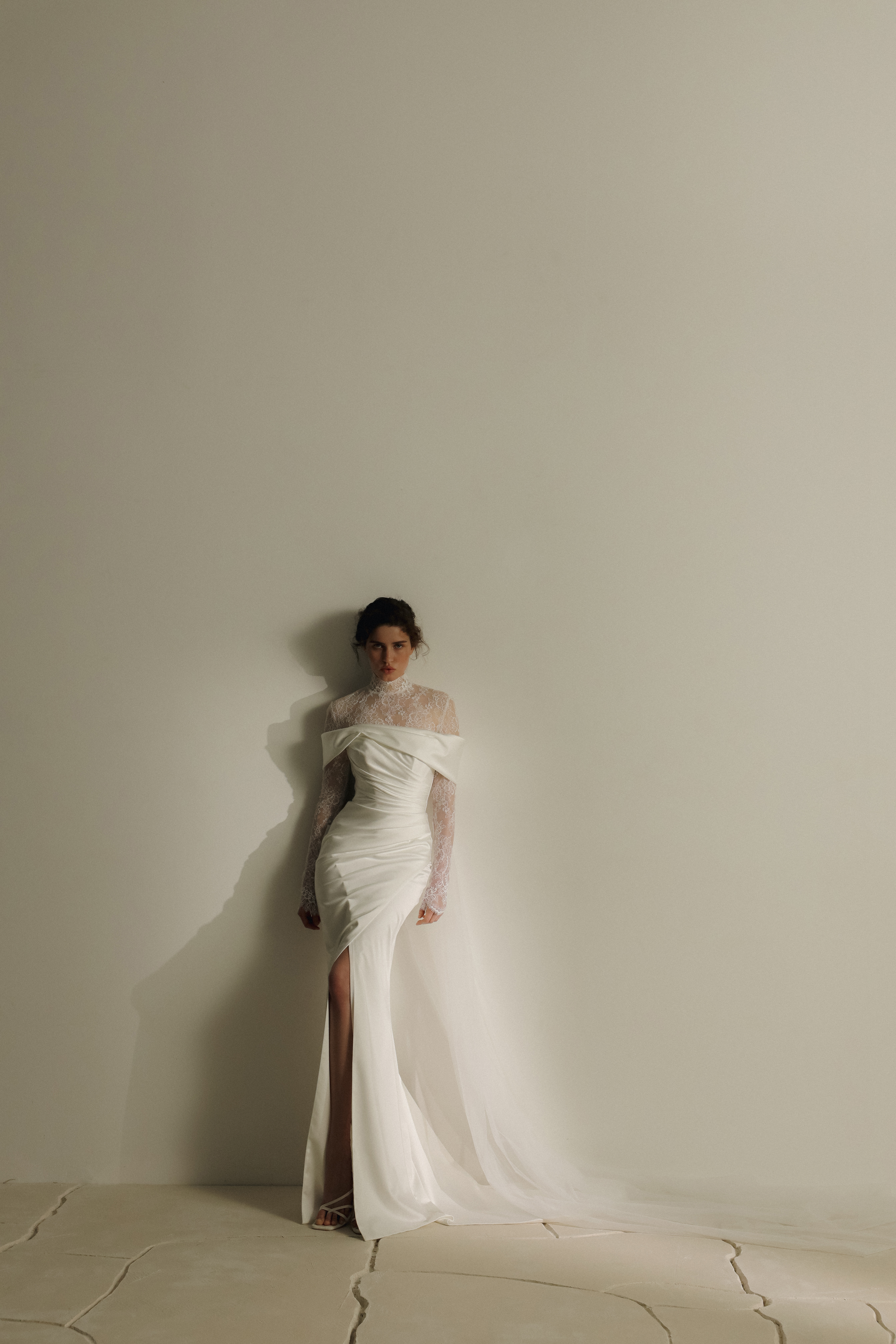 Das elegante Fit’n’Flare Brautkleid betont mit raffinierten Raffungen die feminine Silhouette, während das zarte Spitzenoberteil romantische Akzente setzt – der elegante Beinschlitz verleiht dem Look eine moderne, sinnliche Note.