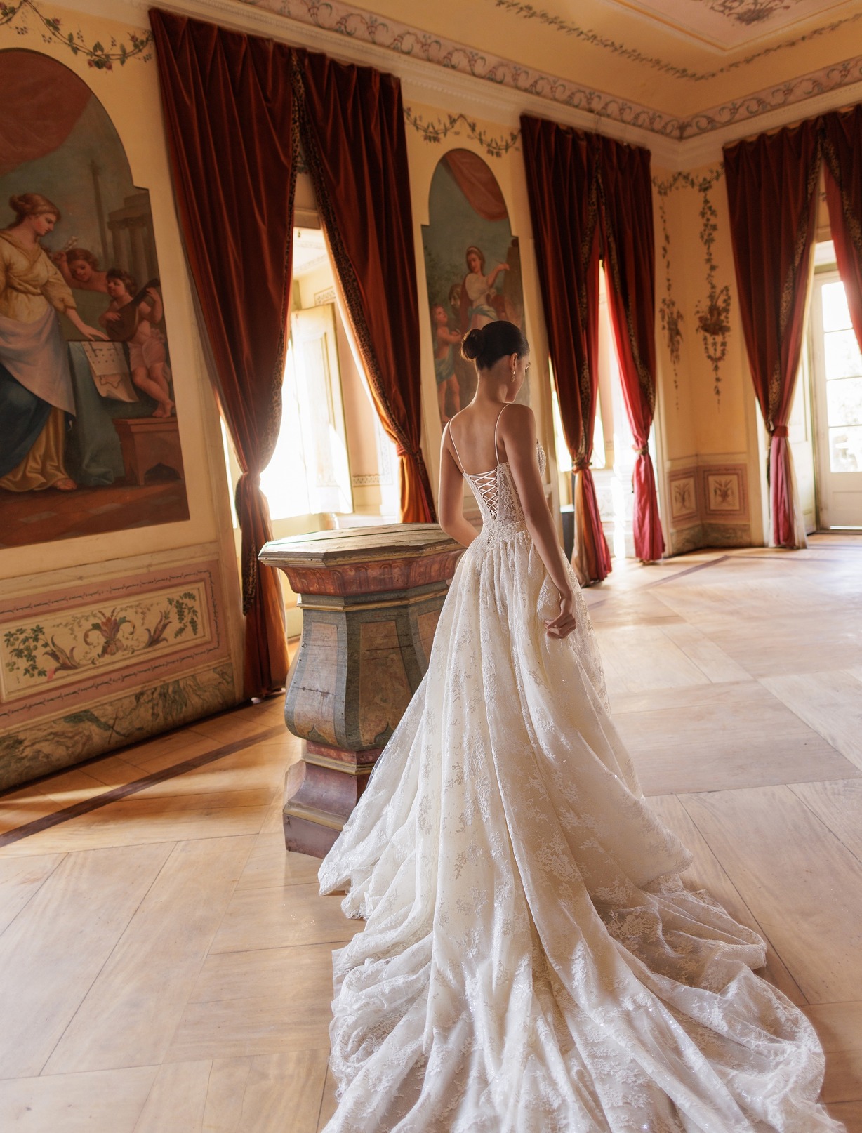 Elegantes Spitzen- und Pailletten-Brautkleid mit figurbetontem Korsett und schlankem Rock, wandelbar zum Prinzessinnenstil durch voluminösen, bestickten Überrock mit langer Schleppe – perfekt für glamouröse und unvergessliche Hochzeiten.