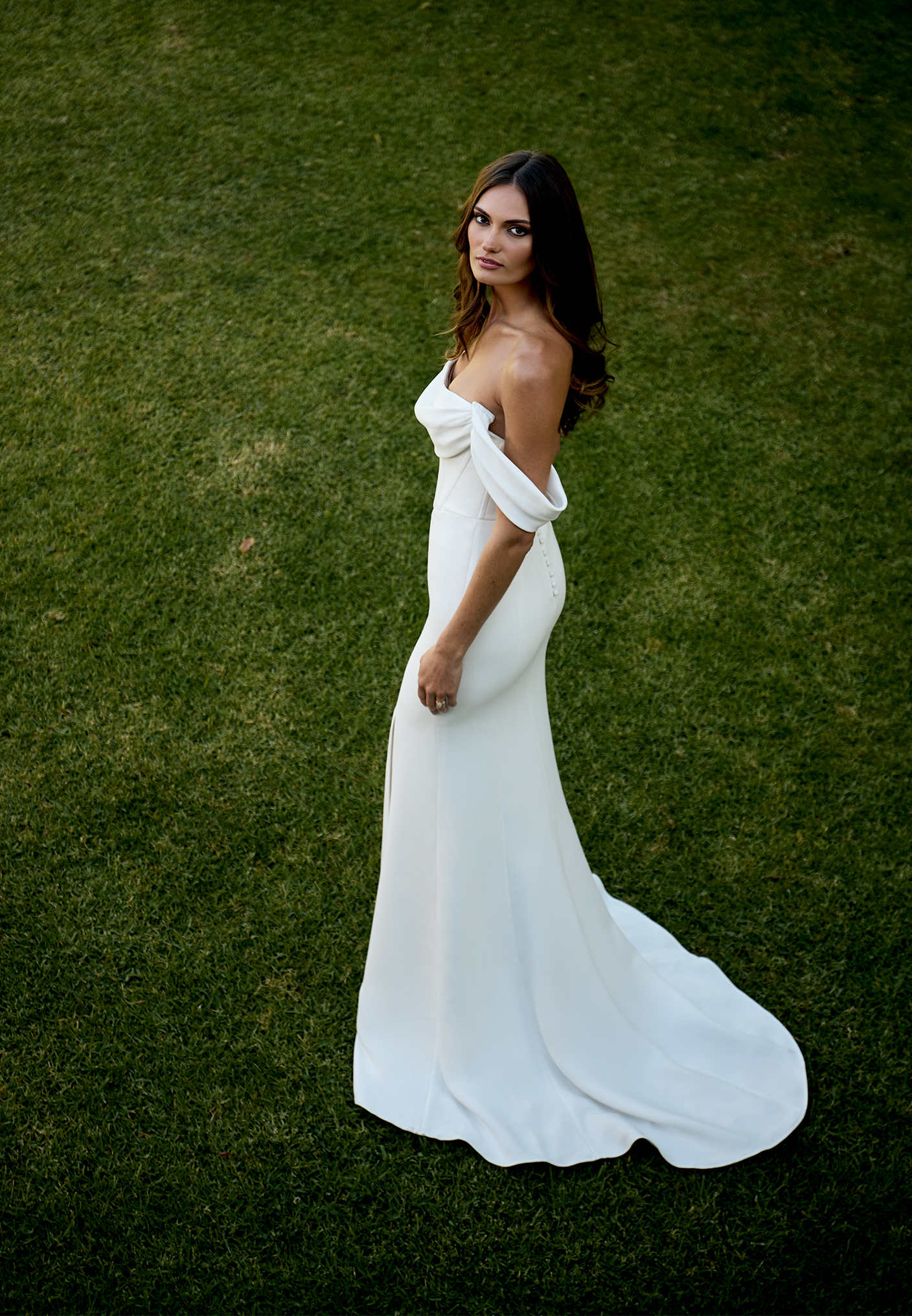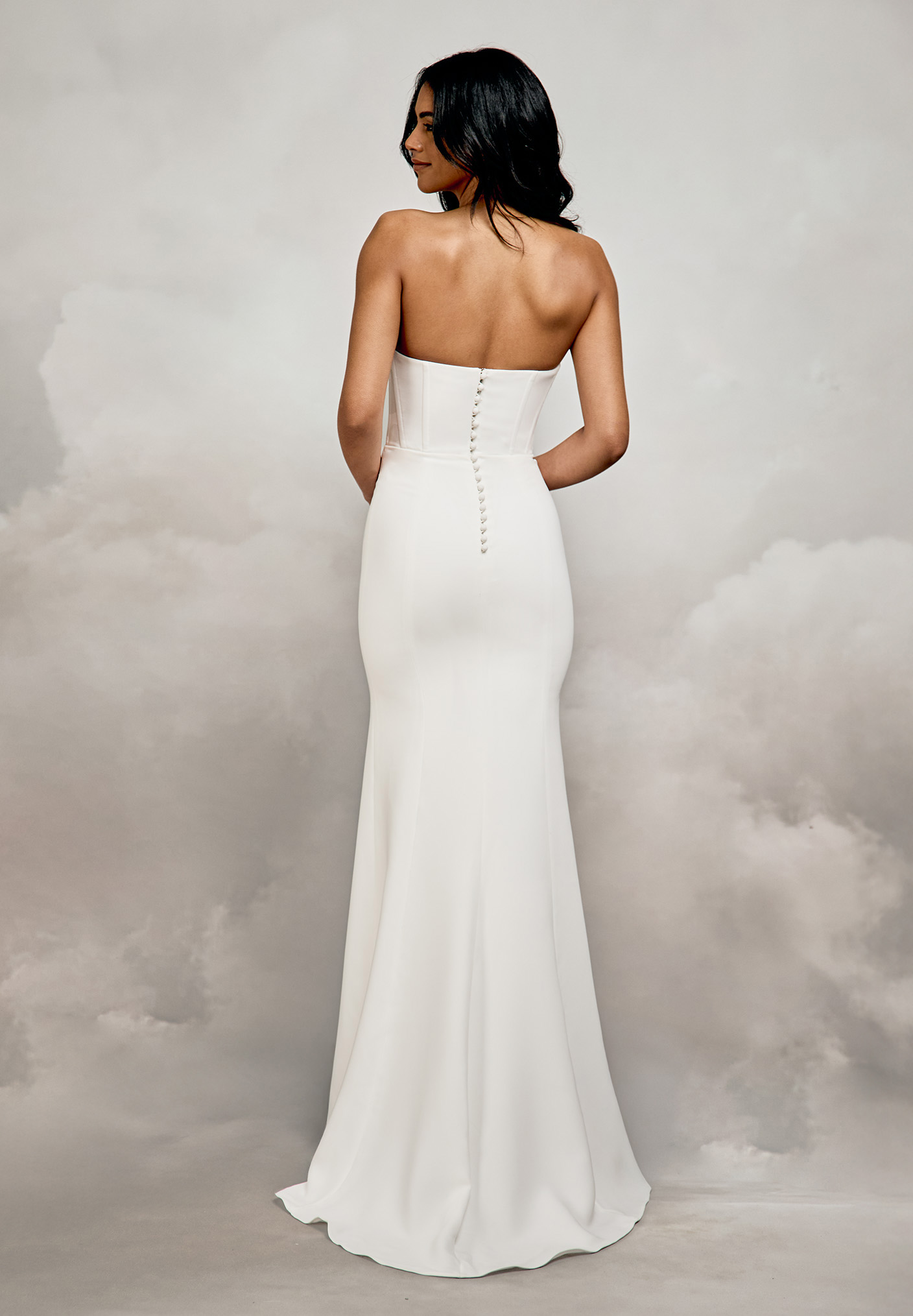 Das Brautkleid Cassidy aus luxuriösem Crepe formt dank trägerlosem Corsagen Oberteil und Basque-Taille eine elegante, figurbetonte Silhouette. Abnehmbare Drapierungen ermöglichen einen wandelbaren Brautlook von modern-minimalistisch bis romantisch.