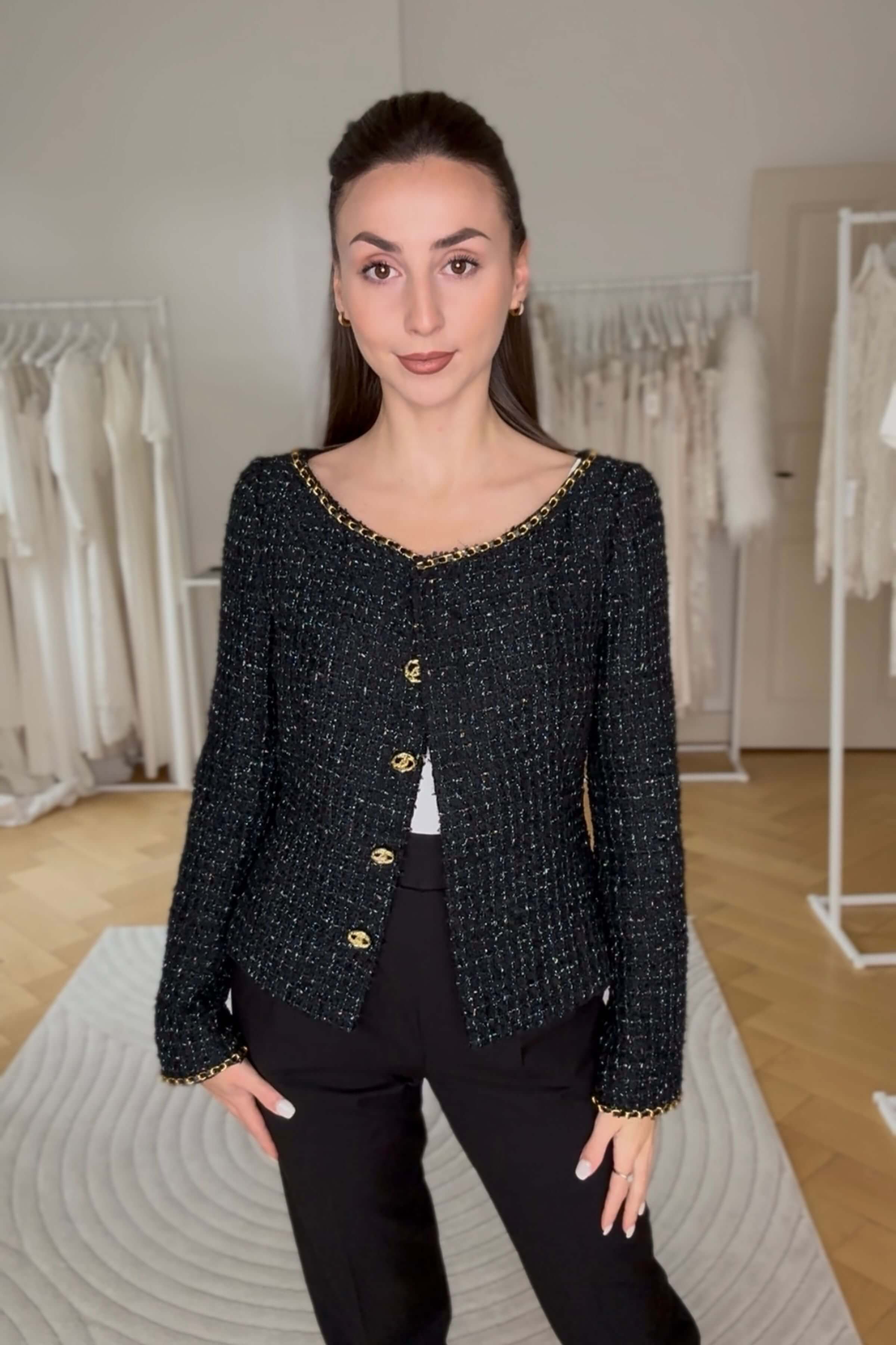 Kastige Bouclé-Jacke von Chanel mit leichtem Glanz und mit weitem Ausschnitt, der mit einer goldenen Gliederkette verziert ist. Goldene Statementknöpfe mit Chanel-Logo. Taillierte, kurze Passform. Ein Outfit, das sich für Hochzeitsgäste oder andere Events super eignet.