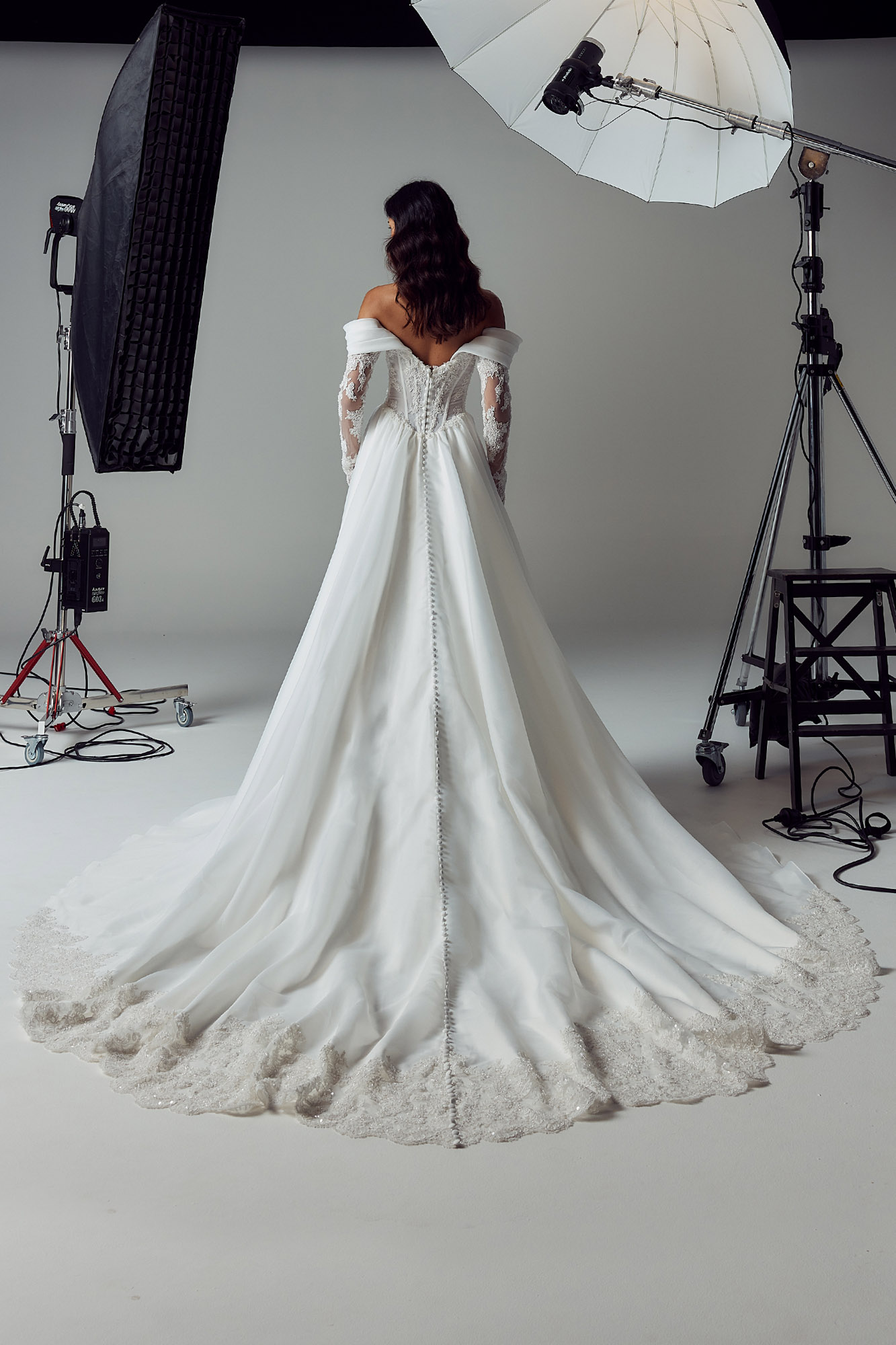 Das Cherie Brautkleid vereint romantische Eleganz mit modernem Stil: Transparenter Organza-Oberteil, feine Spitzen, luftiger A-Linien-Rock und abnehmbare Details fĂĽr vielseitige Looks am groĂźen Tag.