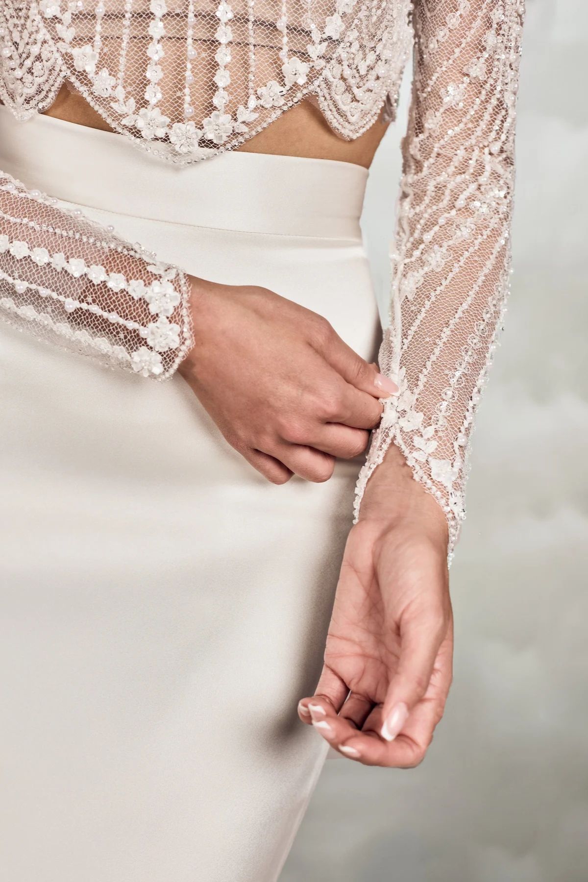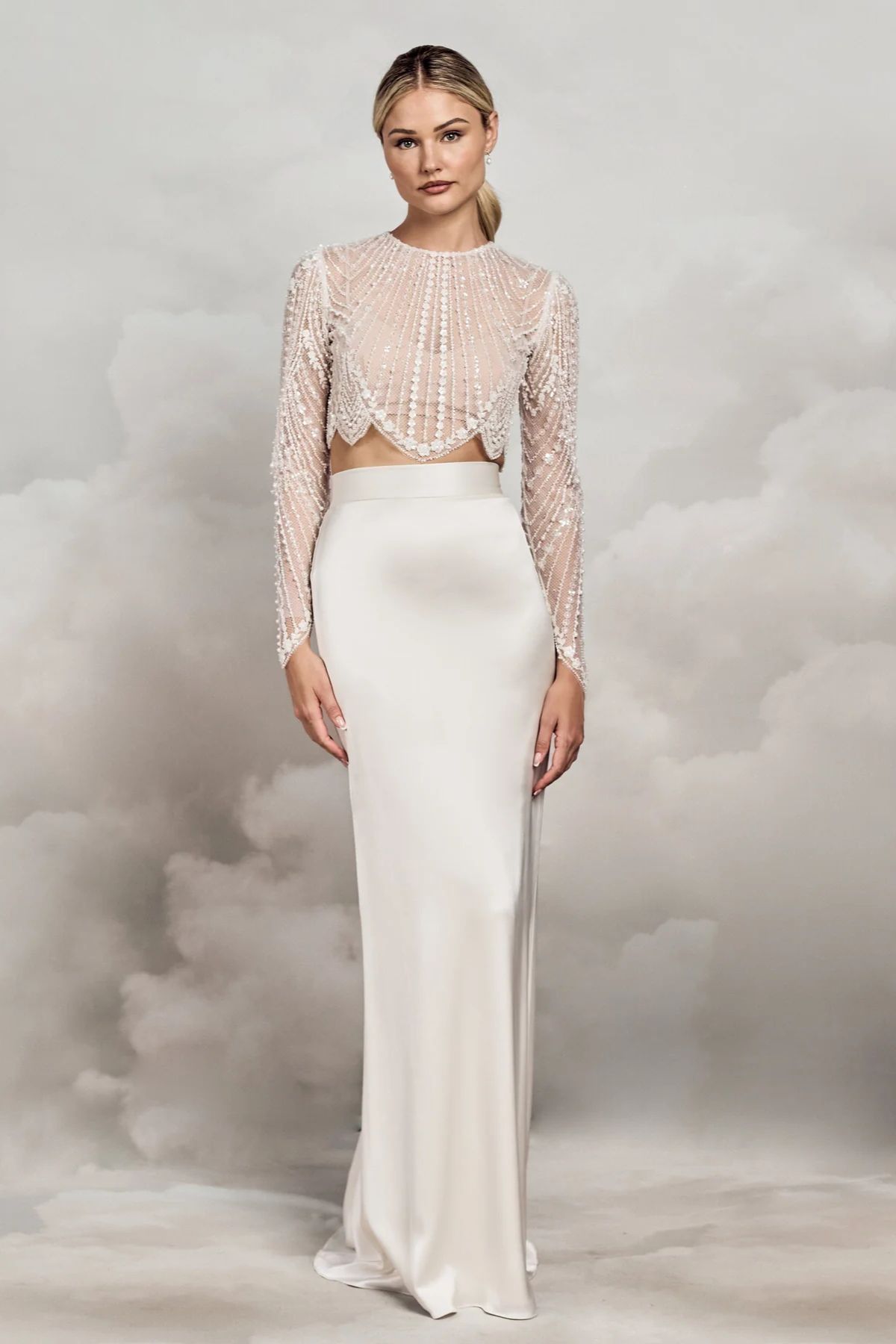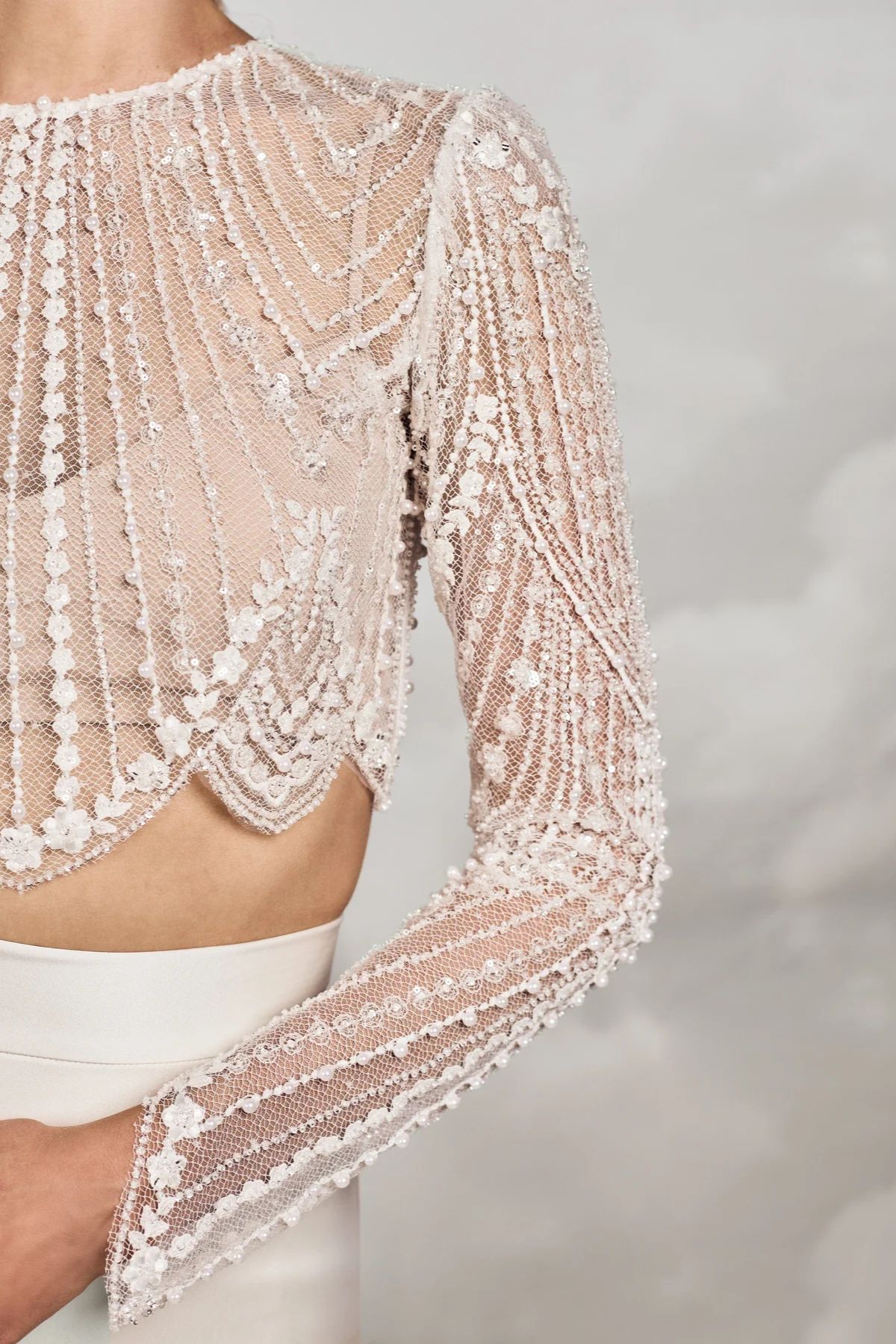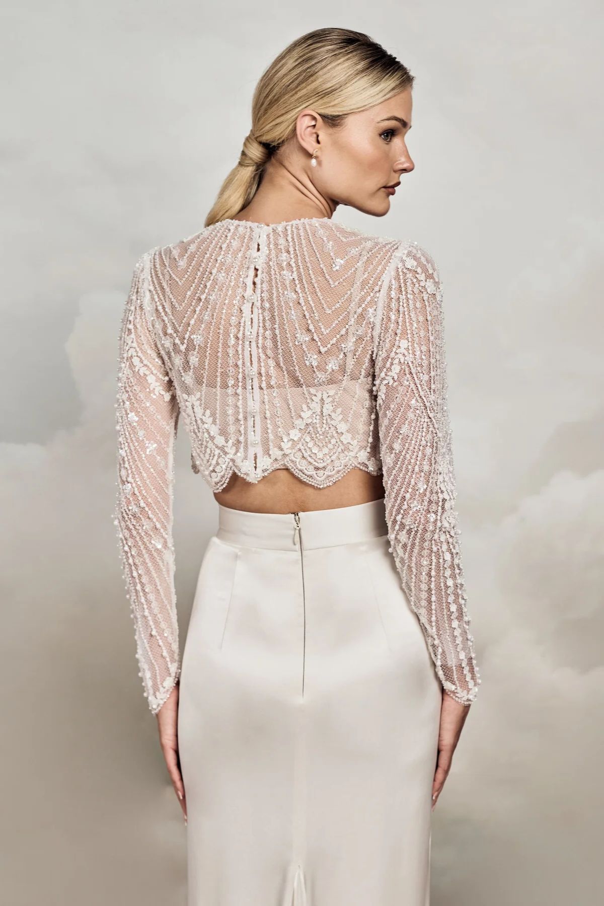 Das romantische Dale Braut-Top aus bestickter Spitze begeistert mit zarten Perlen- und Kristalldetails und verleiht durch seine halbtransparente Optik eine edle, feminine Ausstrahlung. Mit langen Ärmeln, geschwungenem Saum und feiner Knopfleiste am Rücken ist es die perfekte Ergänzung zu Brautkleidern oder Röcken für einen stilvollen Bridal-Look.