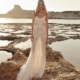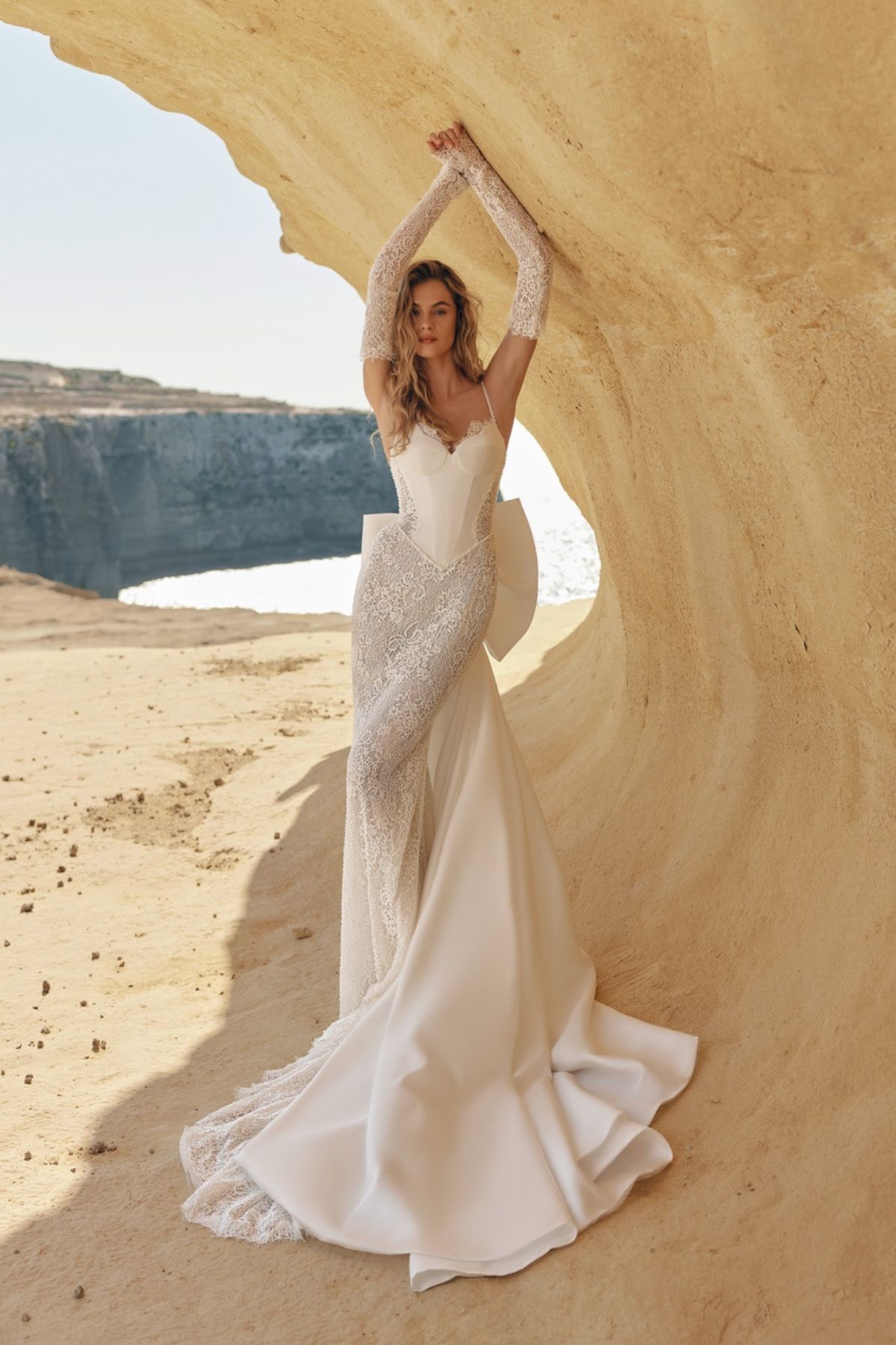 Das Dee Brautkleid in Fit-n-Flare-Silhouette vereint modernen Glamour mit zeitloser Romantik: Ein Spitzen-Corsage-Oberteil, abnehmbare Spitzenärmel und eine majestätische Mikado-Schleppe setzen elegante, unvergessliche Akzente für die selbstbewusste Braut.
