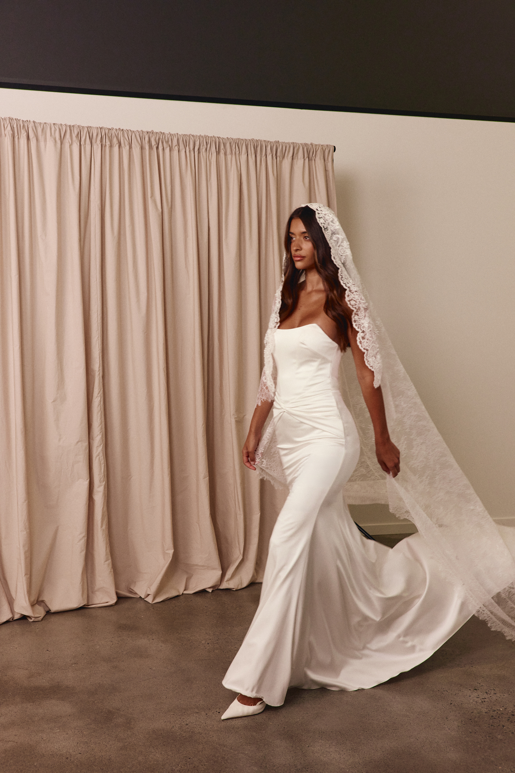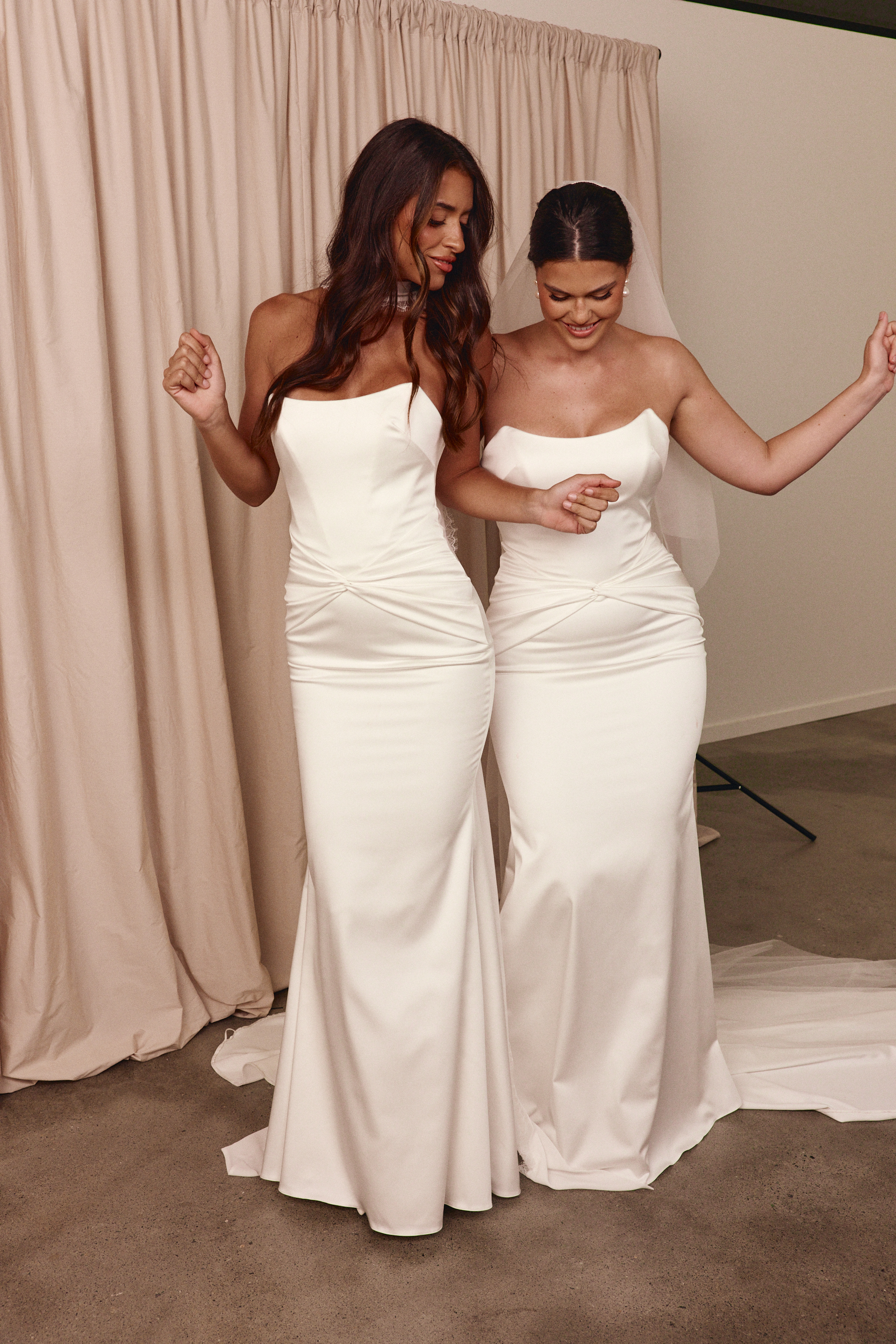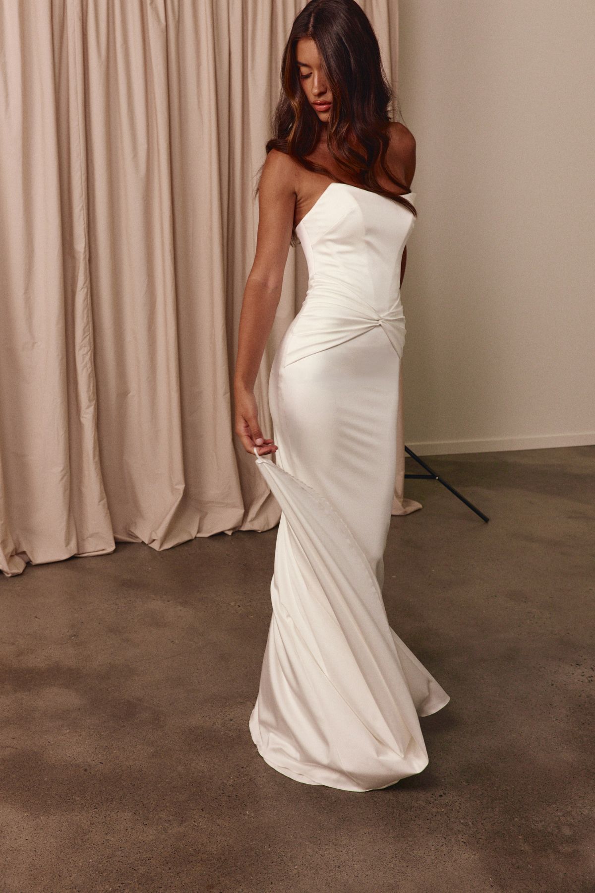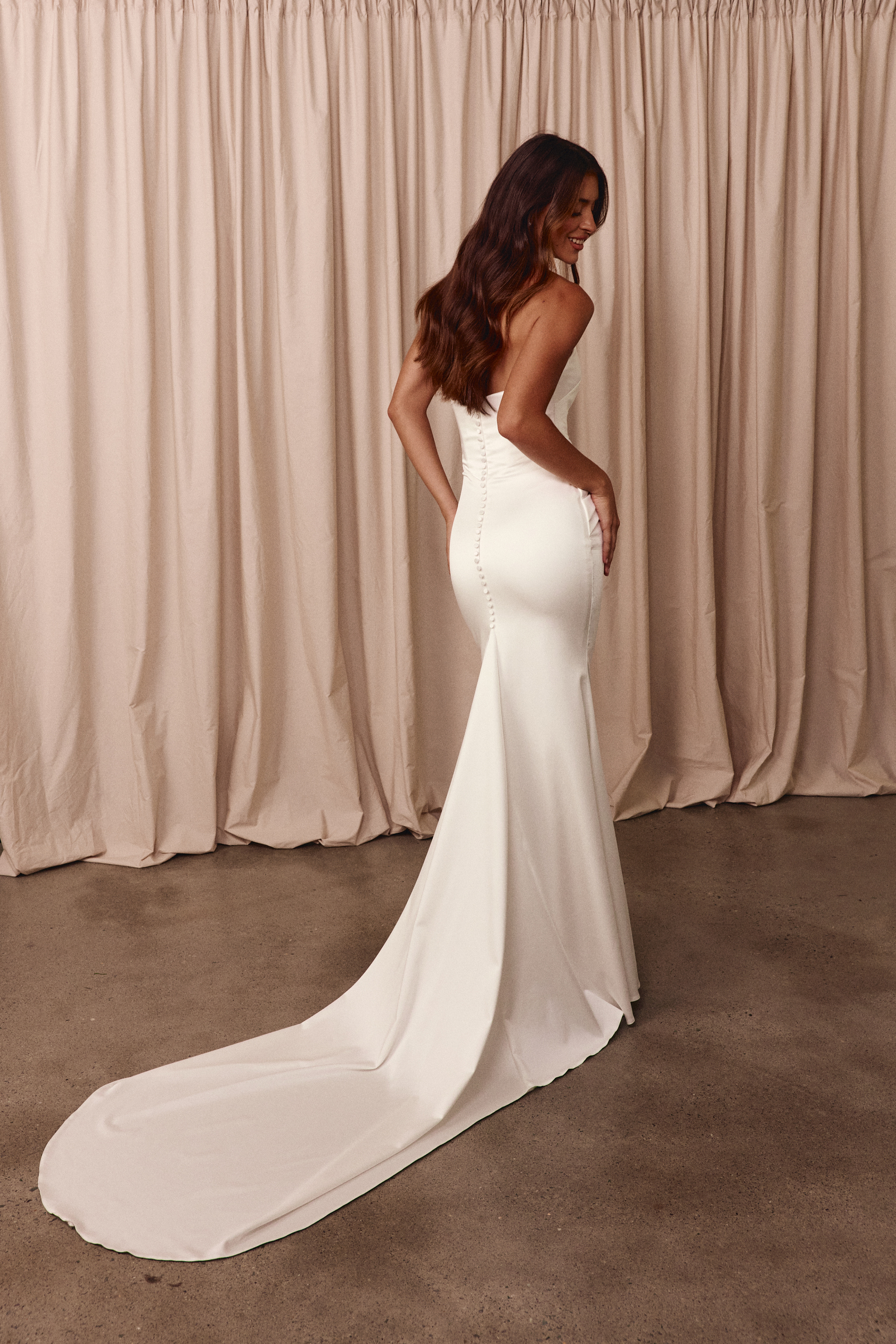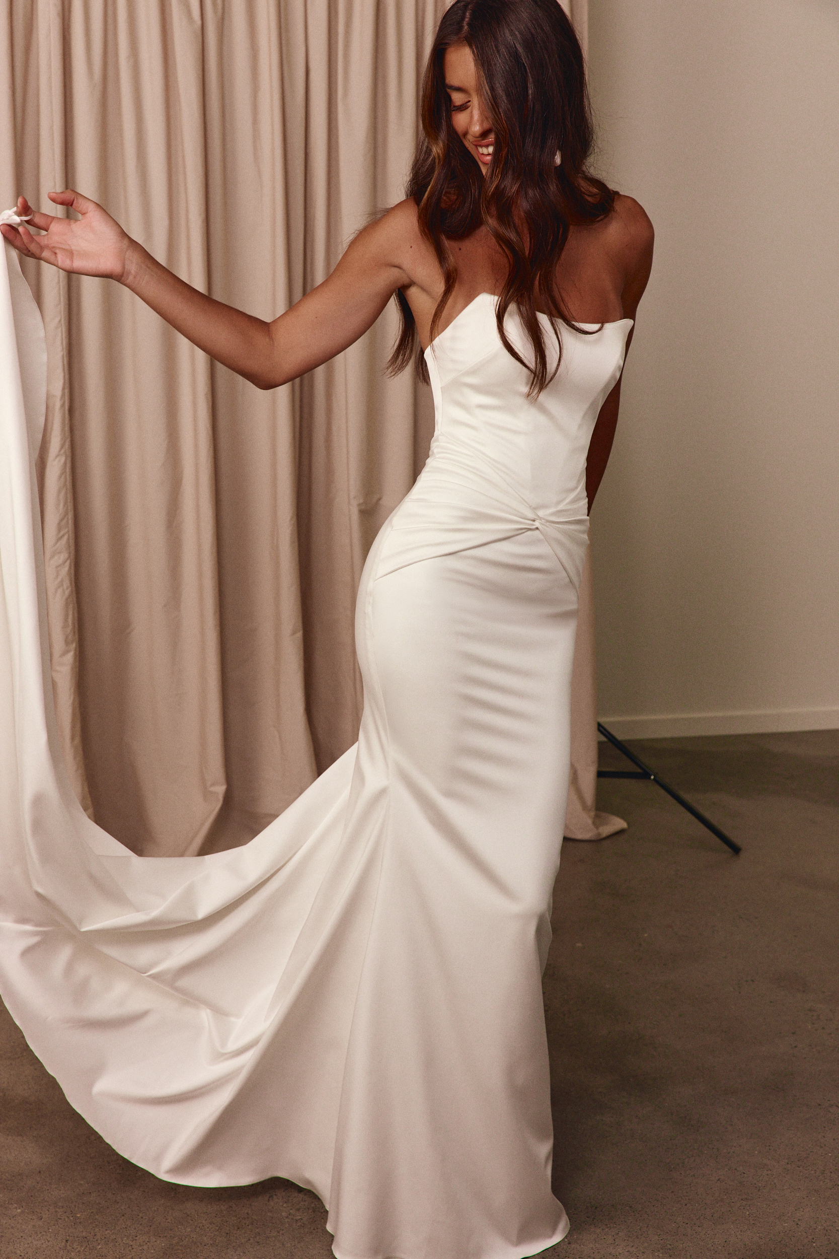 Die elegante Dree Brautrobe verbindet modernen Minimalismus mit perfekter Schnittführung – aus edlem, glänzendem Satin gefertigt, betont sie mit ihrem Corsagen-Bustier und figurformender Technologie die Silhouette und fließt in eine stilvoll verlängerte Schleppe für einen makellosen Auftritt.