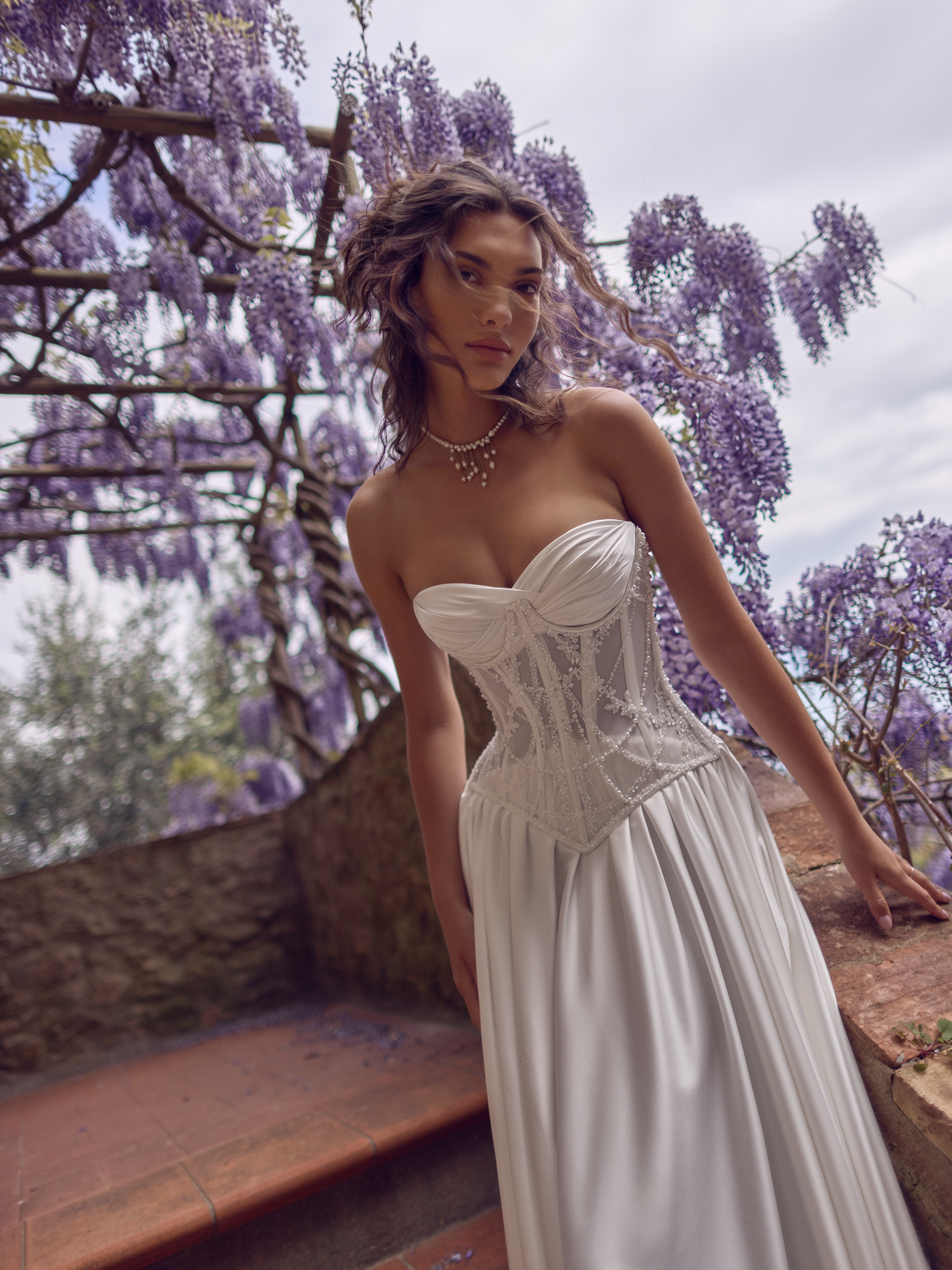 Das Brautkleid Erato besticht durch eine elegante A-Linie, einen fließenden Seidenrock und ein modernes Korsagen-Design mit abnehmbarer Spitzenkorsage für wandelbare Looks. Zarte Satin-Cups, eine feine Schleppe und die leichte Silhouette machen es perfekt für Bräute, die minimalistischen Stil mit romantischen Details verbinden möchten.