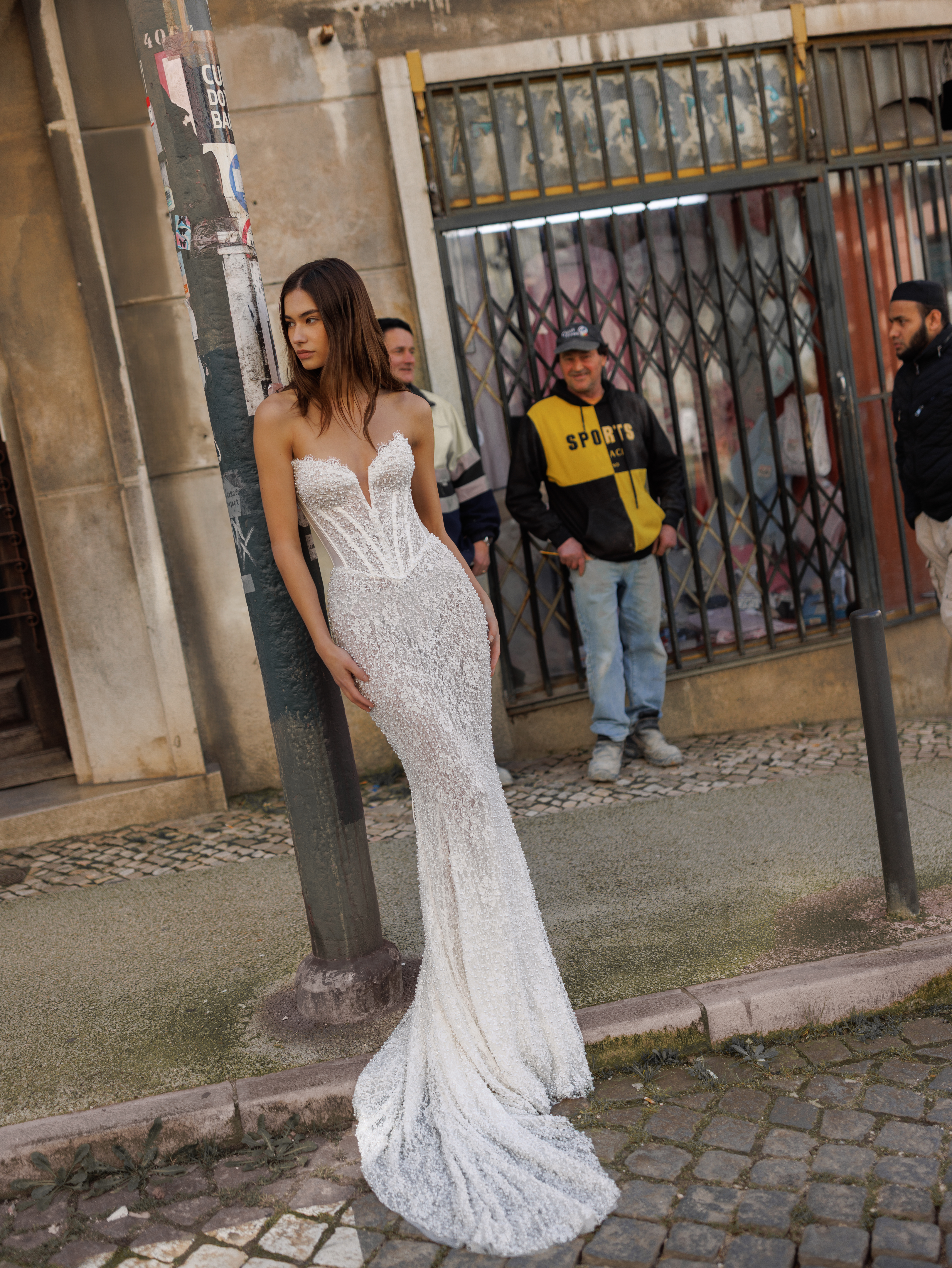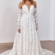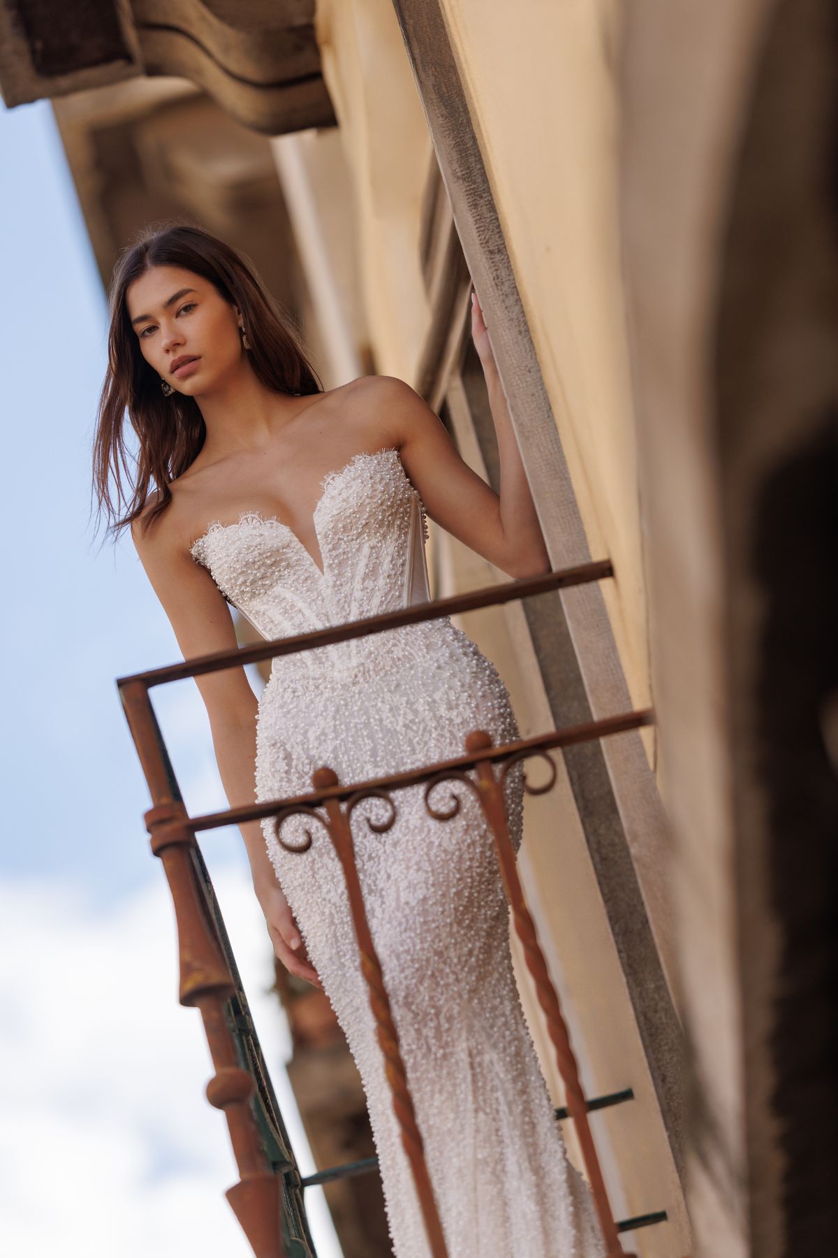 Elegantes Fit-and-Flare-Brautkleid mit tiefem V-Ausschnitt und strukturiertem Korsett, das die Figur perfekt betont. Aufwendige Perlenstickereien und ein modernes Schnürdesign am Rücken mit zartem Mesh verleihen dem Hochzeitskleid eine stilvolle und zeitgemäße Note.