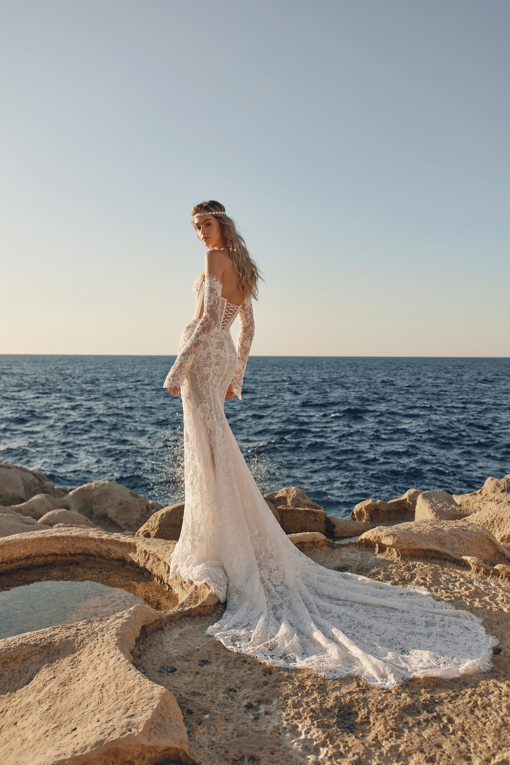 Das luxuriöse Mermaid-Brautkleid Fjord besticht durch elegante, abnehmbare Ärmel, einen taillierenden Corsagen-Schnitt mit Spitzenrückenschnürung und zarten Tülllagen für einen leichten, romantischen Look.