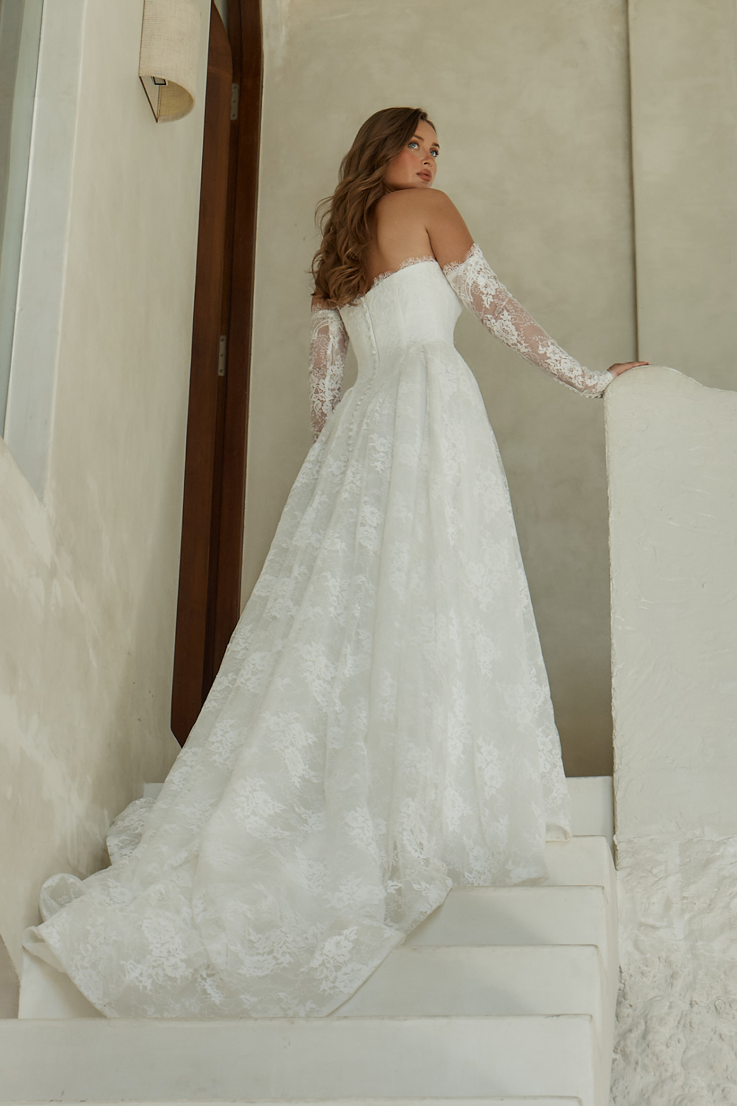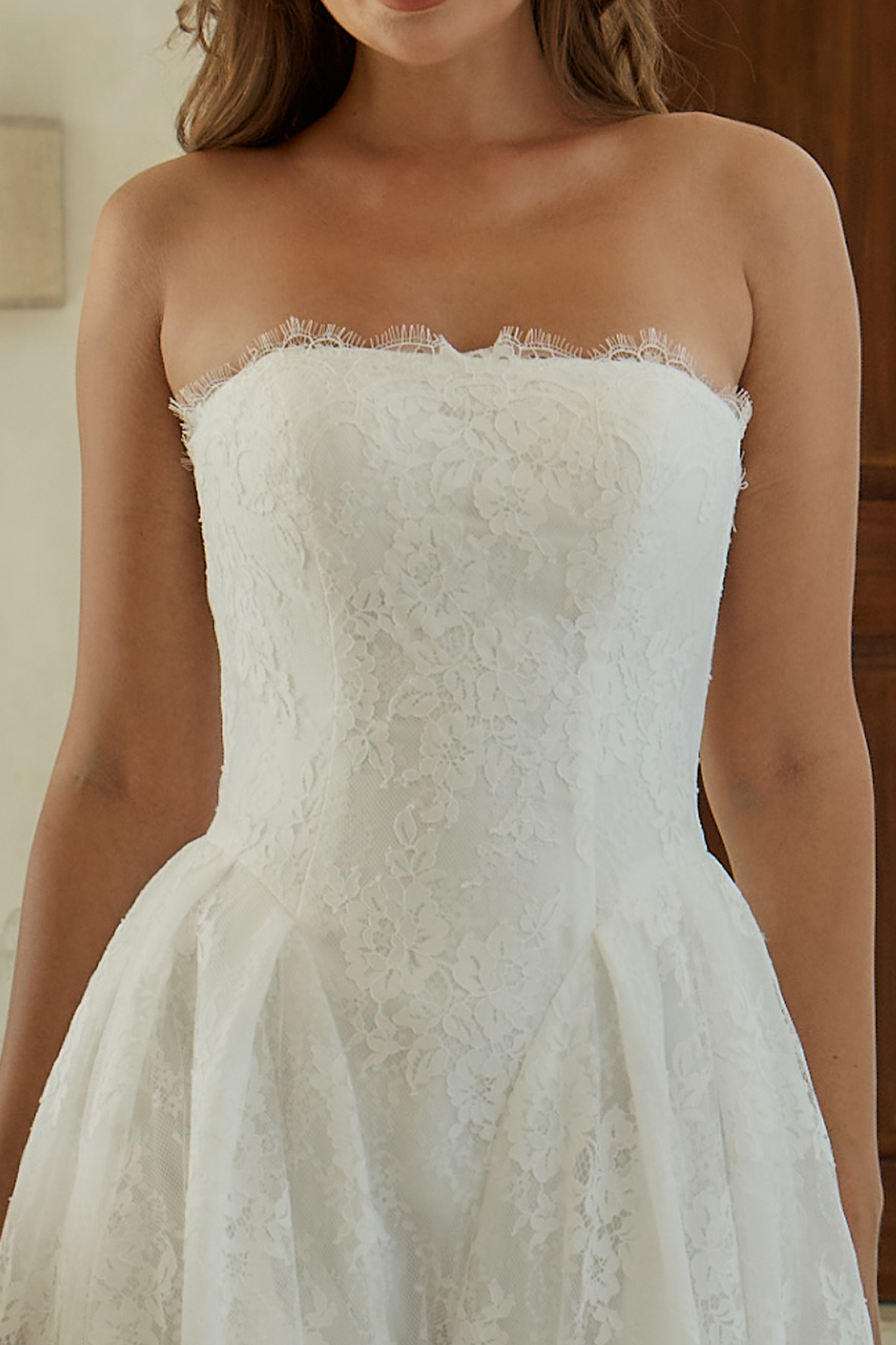Das Garner Brautkleid aus edler Chantilly-Spitze überzeugt mit modernem trägerlosem Ausschnitt, abnehmbaren Off-Shoulder Ärmeln und voluminösem A-Linien-Rock für eine feminine Silhouette. Eine elegante Schleppe und klassische Knöpfe verleihen dem Brautkleid zeitlosen, romantischen Charme.