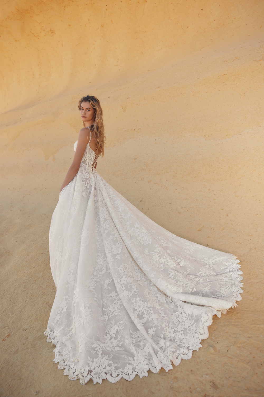 Das Illume Brautkleid begeistert mit einer eleganten A-Linie, feiner Allover-Spitze, perlenverziertem Korsagenoberteil und einer edlen Chapel-Schleppe aus Tüll und Chantilly-Spitze. Dieses romantische Spitzenbrautkleid ist die perfekte Wahl für Bräute, die zeitlose Eleganz, Leichtigkeit und einen luxuriösen Hochzeitslook suchen.