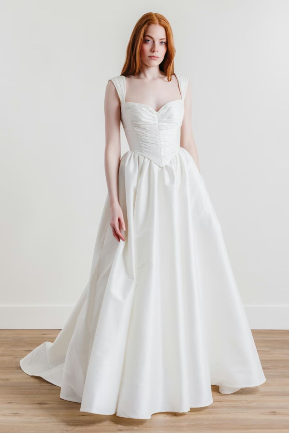 Dieses cleane A-Linien-Brautkleid in edler Wildseiden-Optik ĂŒberzeugt mit einer raffinierten Corsage, Basket-Waist und zarten TrĂ€gern. Praktische Taschen verleihen dem modernen, eleganten Design eine entspannte Leichtigkeit.