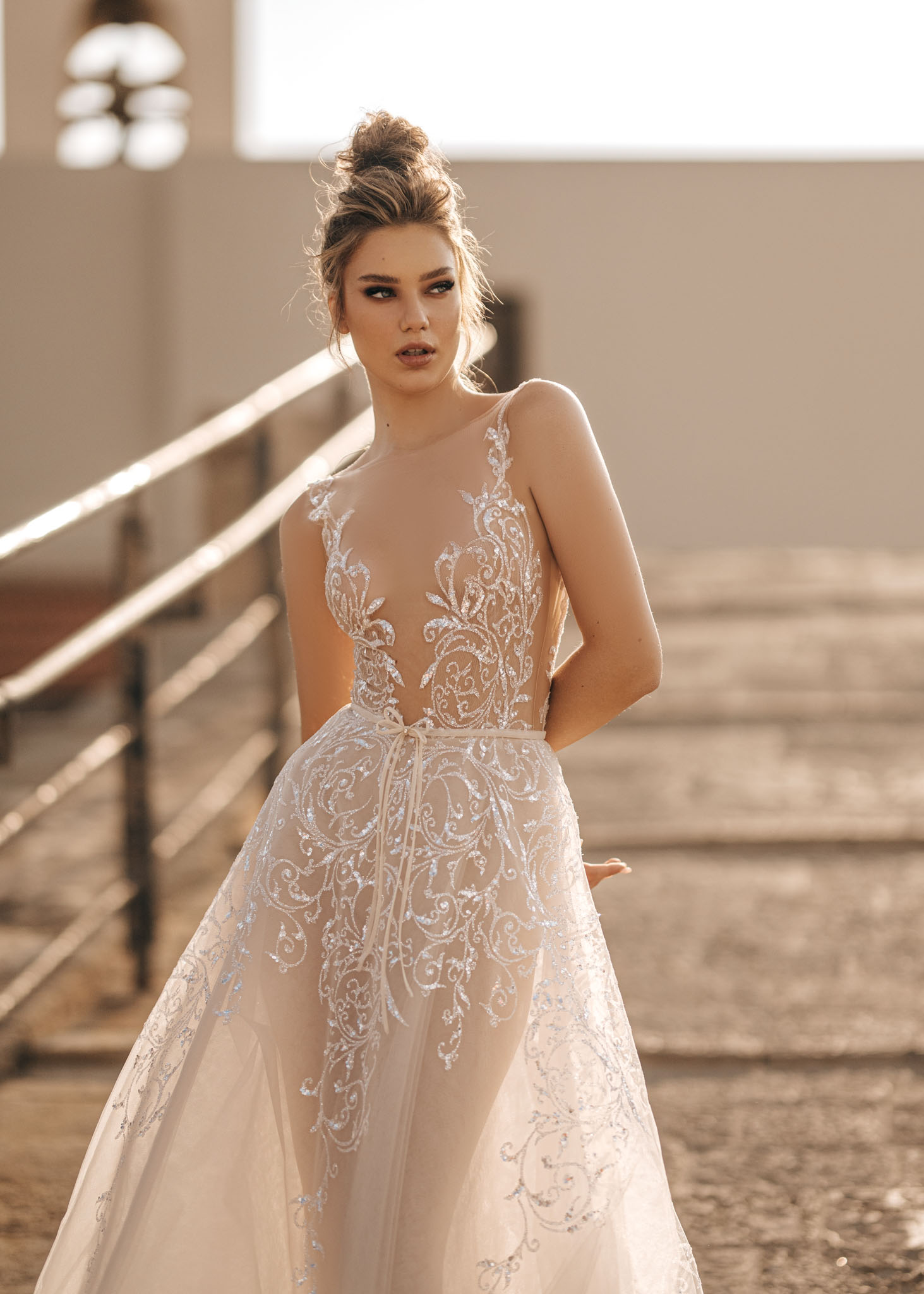 Jasmine zeichnet sich durch orientalische Glitzerspitze aus, die sich gekonnt an der Silhouette entlang schmiegt. Tiefer V-Ausschnitt, transparenter A-Linien-Tüllrock und tiefer Rücken.