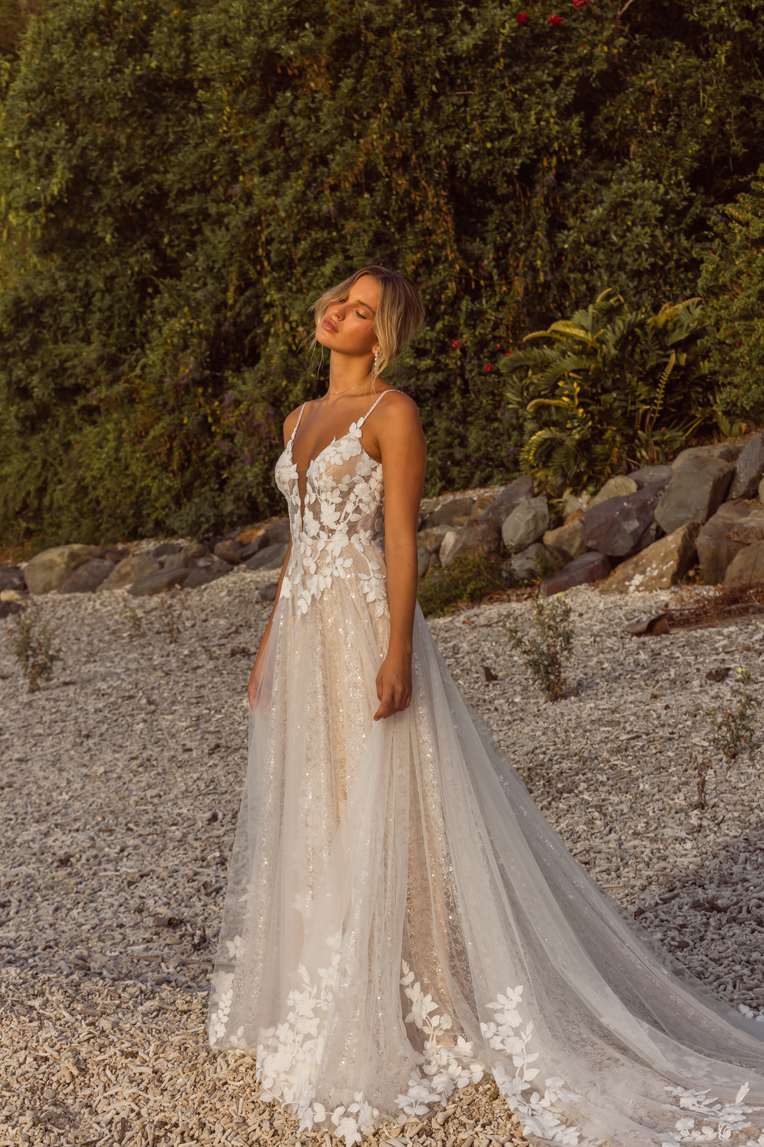 Das Brautkleid Jenica überzeugt mit funkelnder Spitze, A-Linien-Rock und V-Ausschnitt mit tiefem Dekolleté – elegant, zeitlos und ein echter Hingucker.