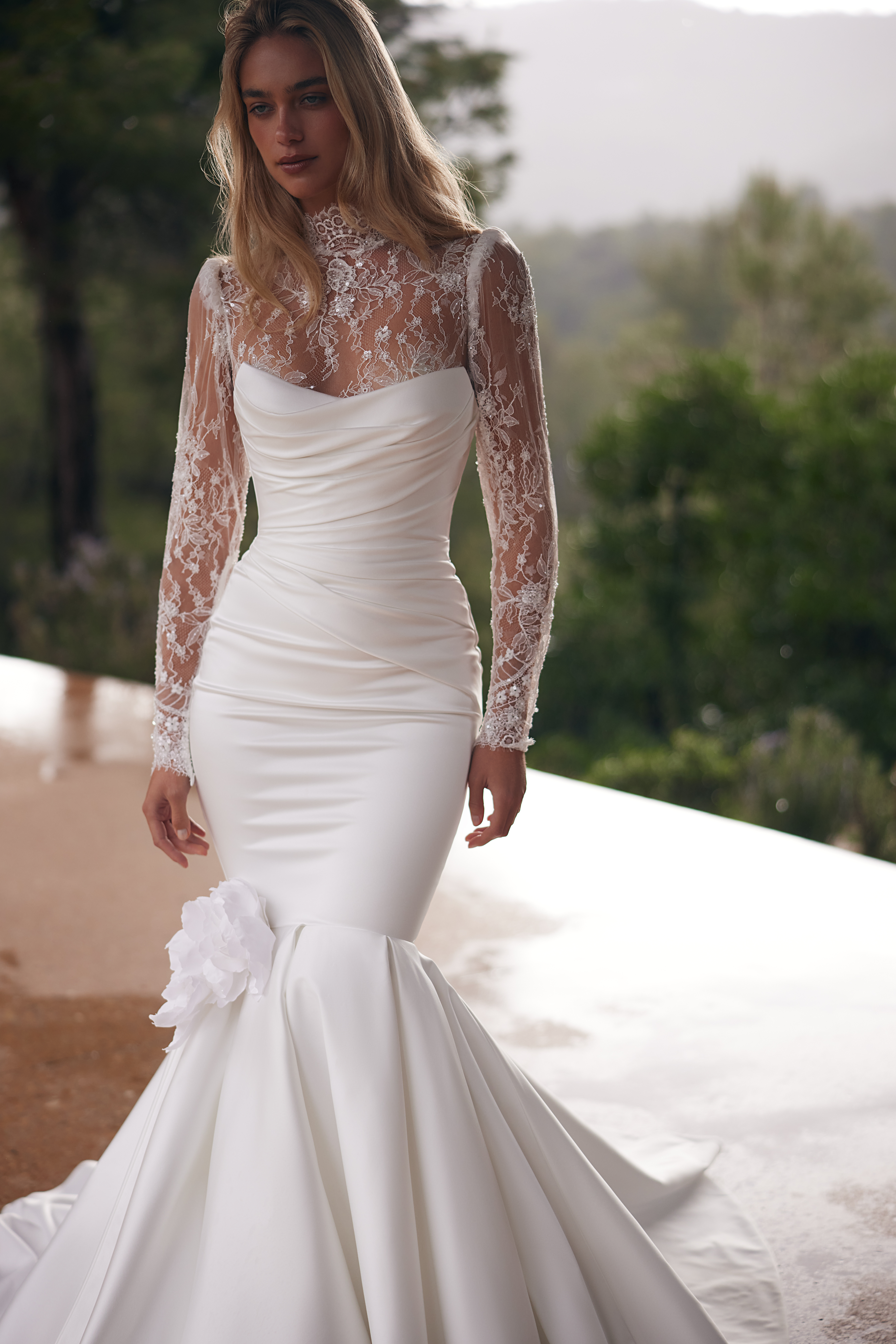 Der elegante Spitzenbody Laurent mit hochwertiger All-over-Spitze und modernem Stehkragen lässt sich vielseitig kombinieren und ist die perfekte Ergänzung für cleane, moderne Brautkleider. Er verleiht jedem Bridal-Look eine feminine, edle Note.
