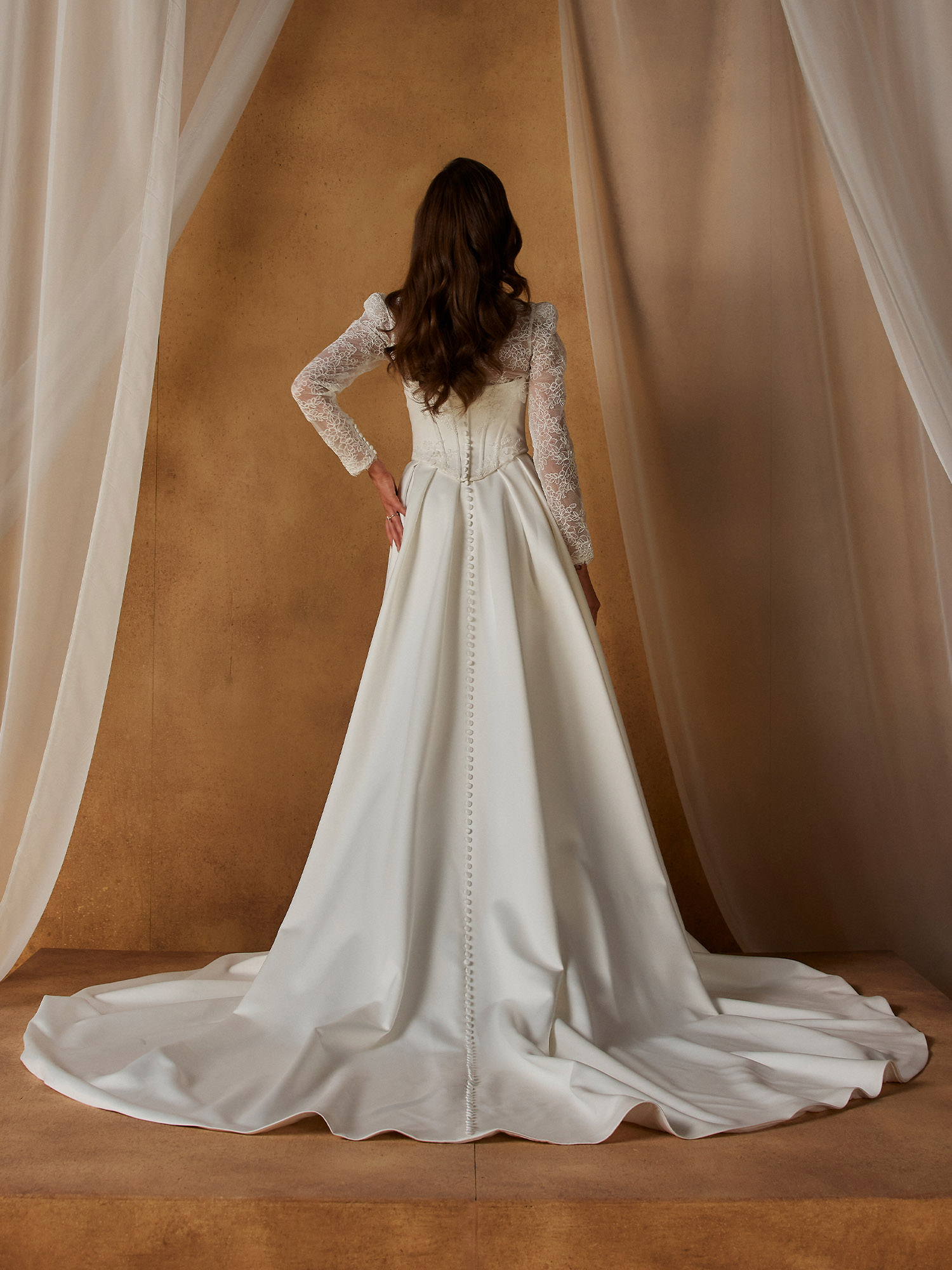 Der Norton Brautrock aus edlem Velvet-Satin besticht durch eine minimalistische A-Linie mit eleganten Falten und modernem Beinschlitz. Vielseitig kombinierbar, ideal für einen individuellen und wandelbaren Hochzeitslook.