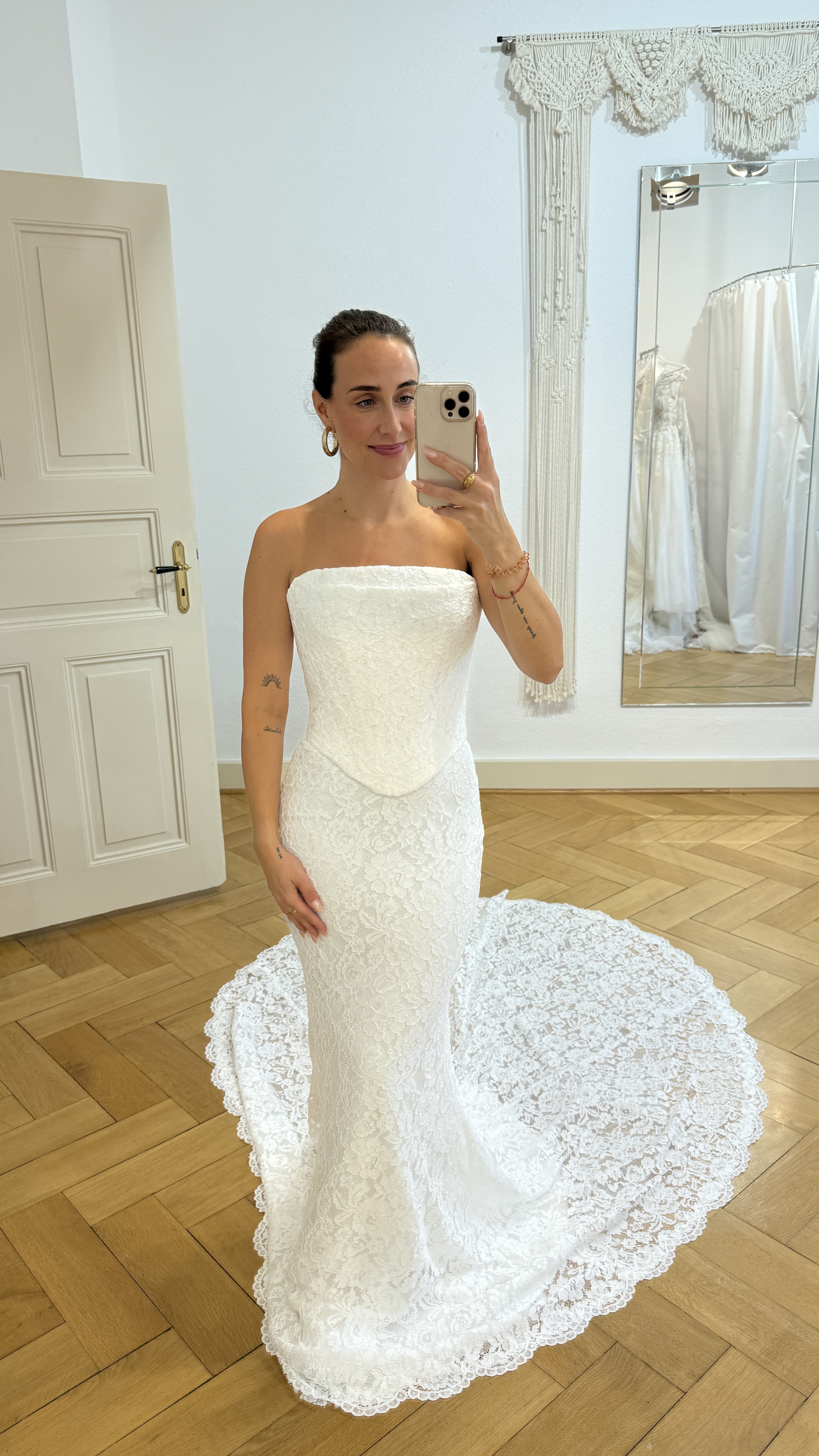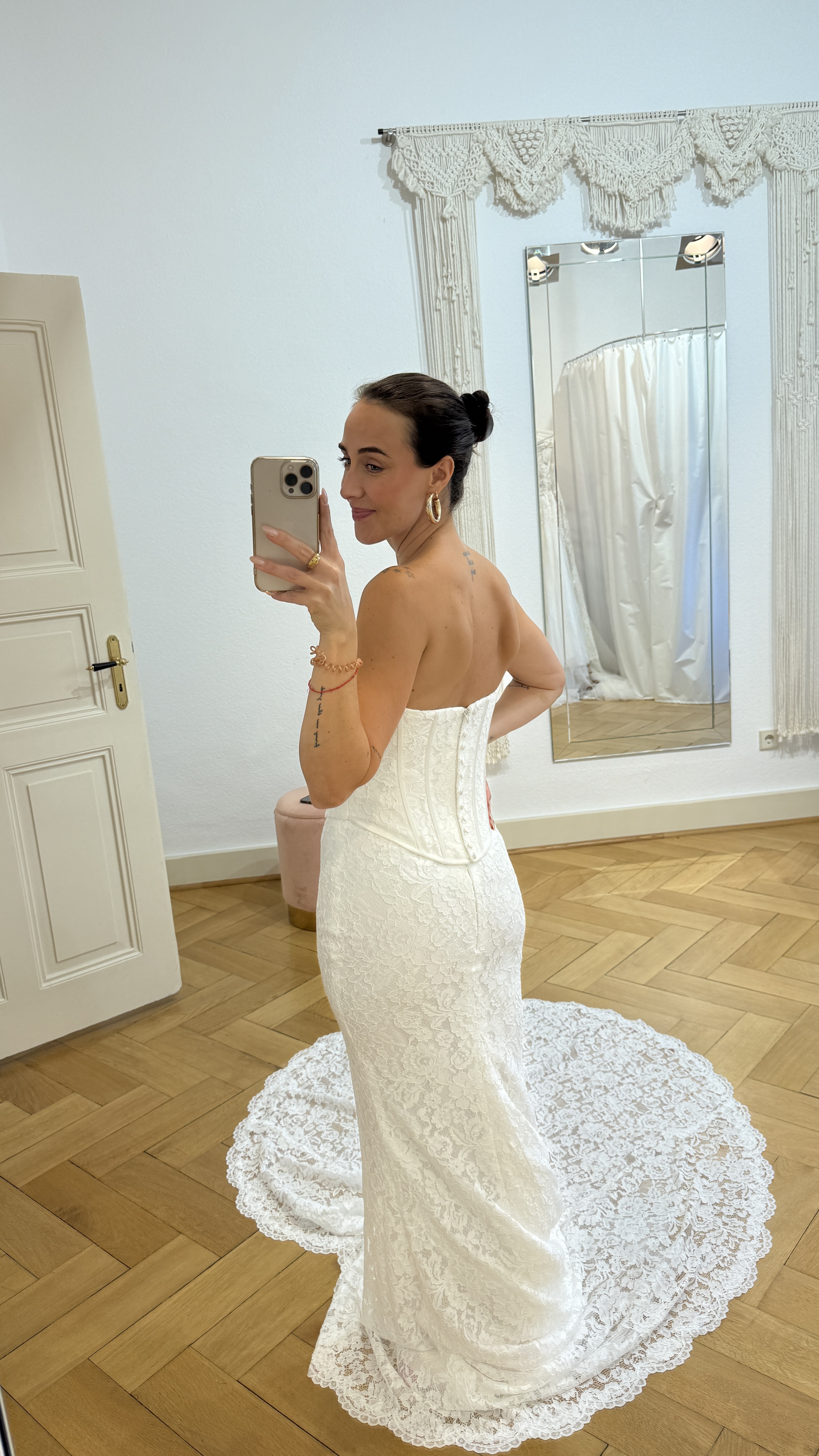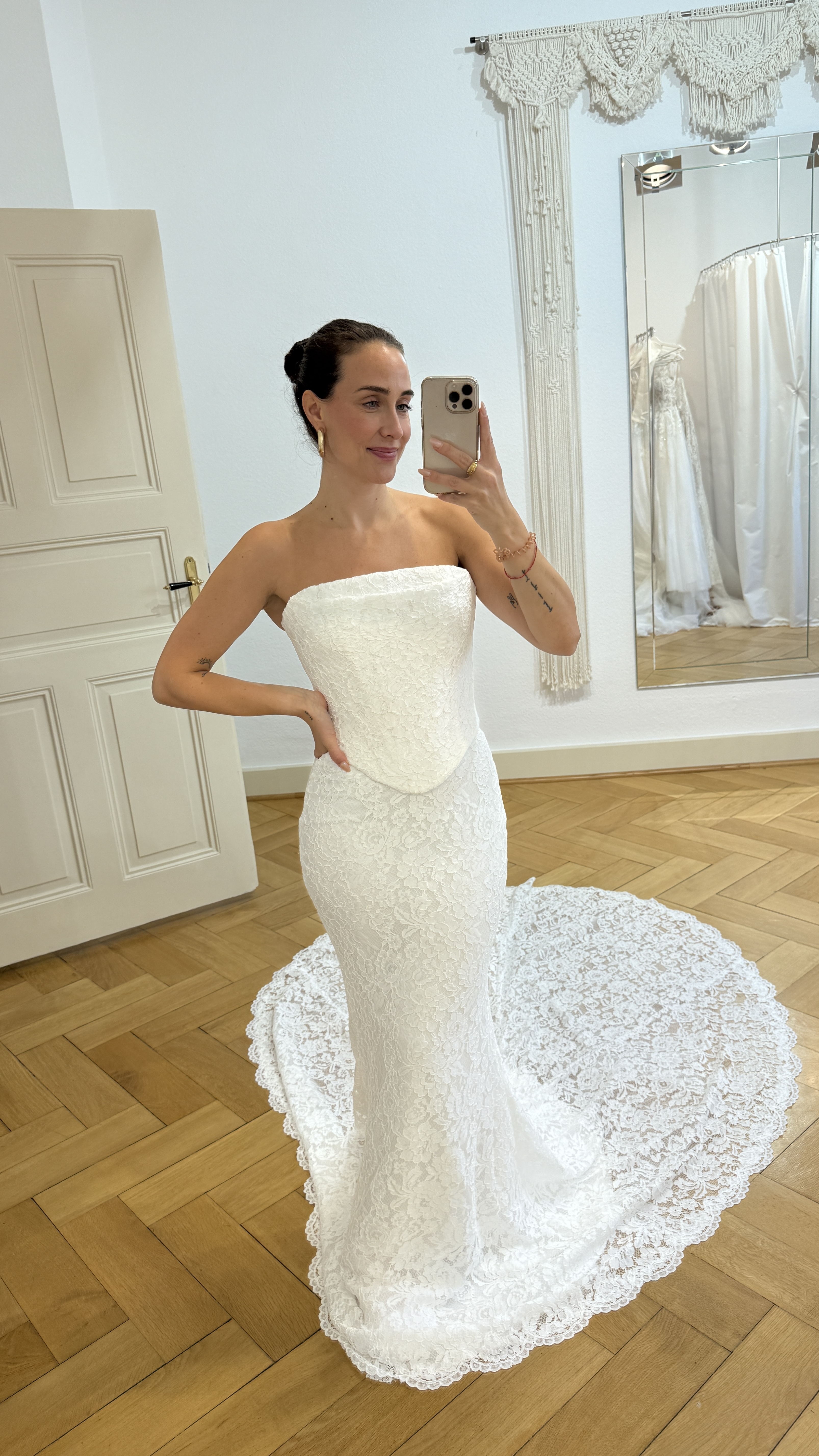 Dieses elegante Fit’n’Flare Brautkleid aus feiner Spitze ist die perfekte Wahl für Bräute, die Eleganz und Modernität vereinen möchten. Die edle Corsage zaubert eine wunderschöne Taille und unterstreicht die feminine Silhouette. Ein Spitzen-Brautkleid im modernen Fit’n’Flare-Schnitt, das zeitlose Eleganz mit raffinierter Leichtigkeit verbindet – ideal als Hochzeitskleid mit Corsage für einen unvergesslichen Auftritt.