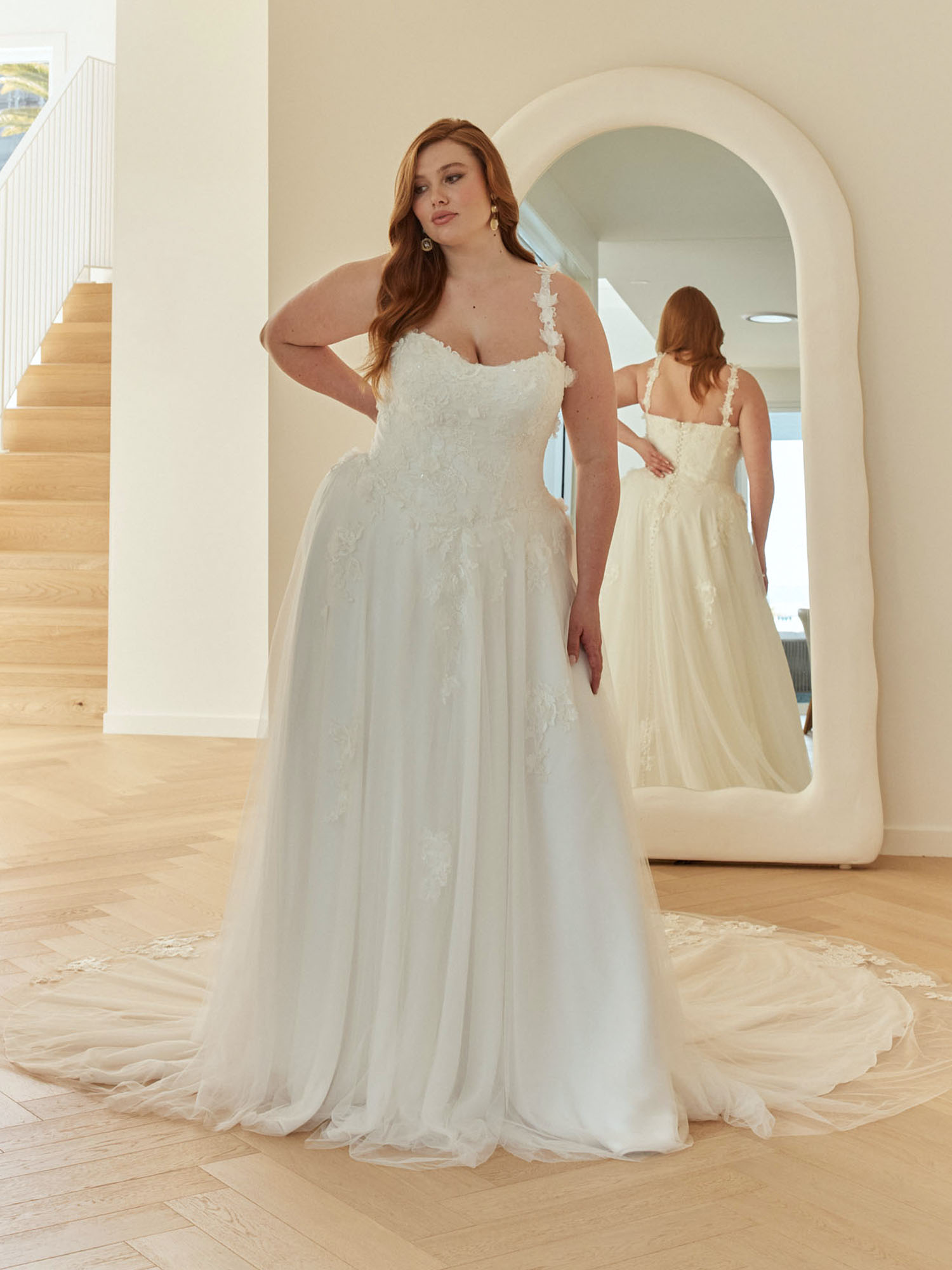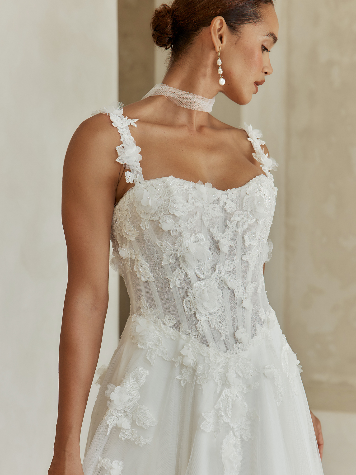 Das Reed Brautkleid vereint romantische Eleganz mit künstlerischem Design: Aus feiner Chantilly-Spitze mit 3D-Stickereien, einem femininen Basque-Taille-Schnitt und einem fließenden A-Linien-Tüllrock mit passenden Motiven, bietet es vielseitige Tragemöglichkeiten mit abnehmbaren Schulterträgern und modernem Tüllkragen.