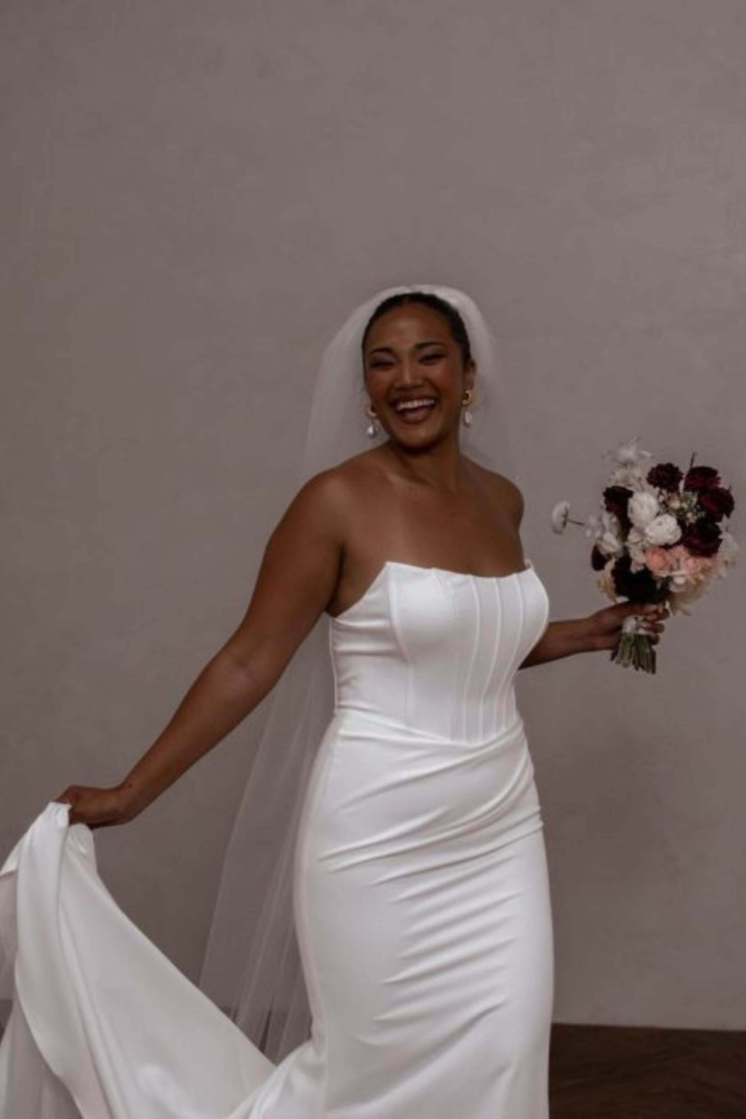 Rhode Satin ist ein atemberaubendes, schulterfreies Brautkleid aus Satin, das moderne Eleganz mit zeitloser Romantik mĂŒhelos vereint. Das auffĂ€llige Oberteil besticht durch ein spitz zulaufendes Design am DekolletĂ© und markante, sichtbare KorsettstĂ€bchen, die die Silhouette formen und ihr eine verfĂŒhrerische, zugleich stilvolle Note verleihen.