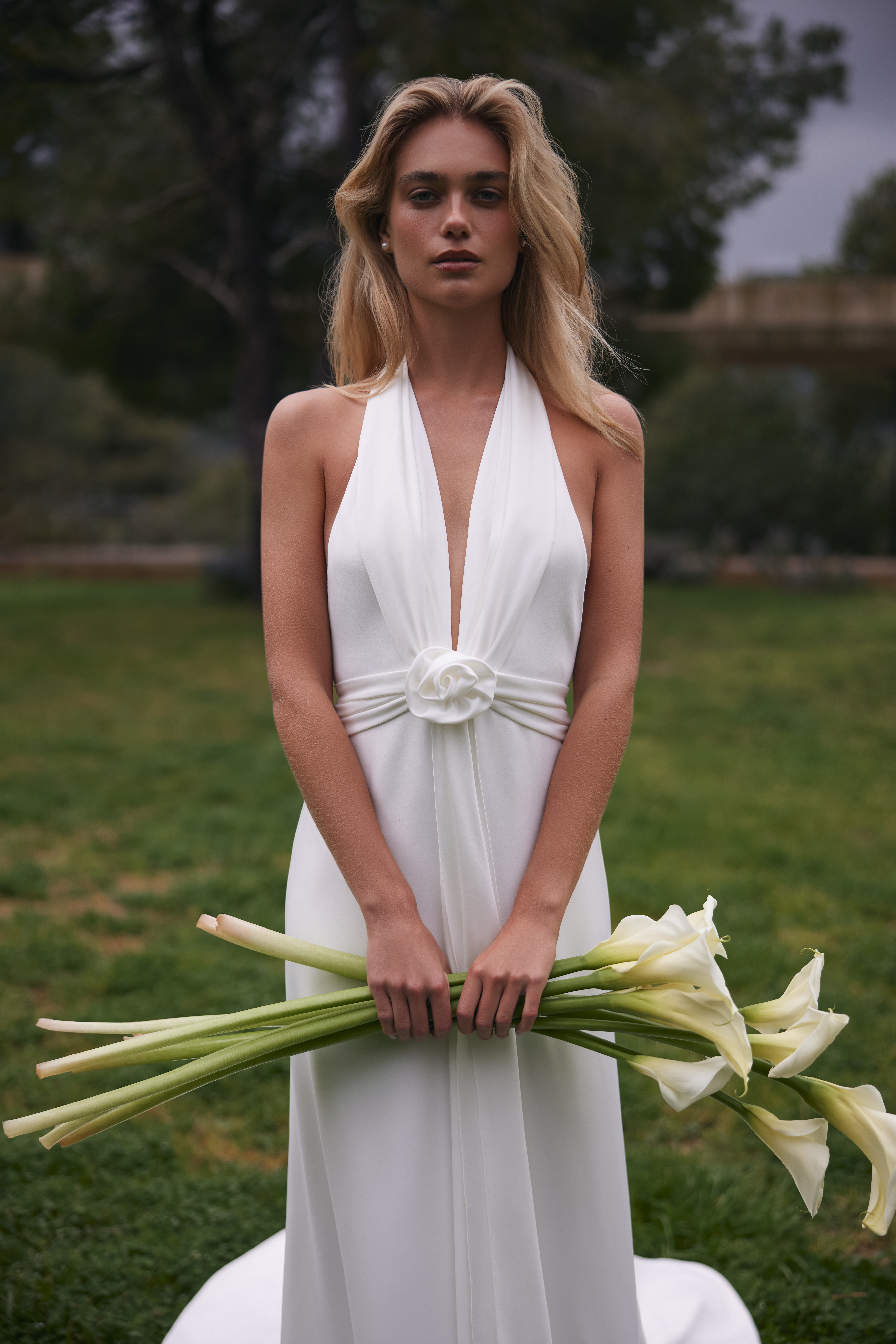 Minimalistisches Design trifft auf moderne Eleganz. Tiefer Halterneck-Ausschnitt und eine feine Stoffblüte an der Taille setzen raffinierte Akzente. Ein zeitloses Kleid für stilbewusste Bräute.