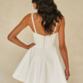 Dieses süße Mini-Brautkleid aus luxuriösem Satin ist perfekt für die minimalistische Braut. Es hat einen modernen quadratischen Ausschnitt, eine betonte baskische Taille und einen weit ausgestellten Rock. Optional mit Überrock.