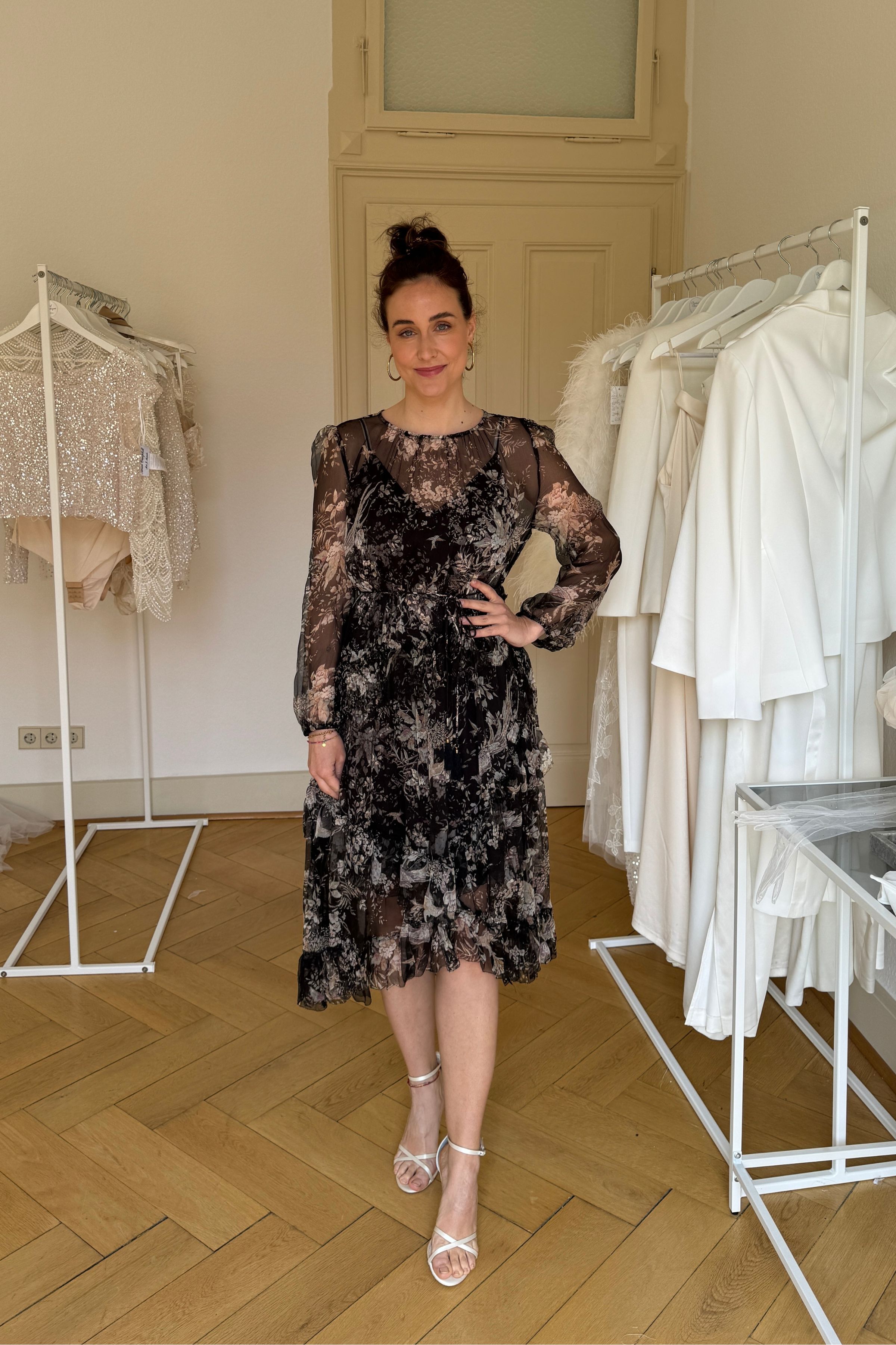 Langärmeliges Seidenkleid von ZIMMERMANN mit floralem Print, Rundhalsausschnitt und gestuftem Rock. Bindegürtel in der Taille zum regulieren der Passform. Midilänge, mit passendem Unterkleid. Ein Kleid, das sich für Hochzeitsgäste, Trauzeugin oder andere Events super eignet.